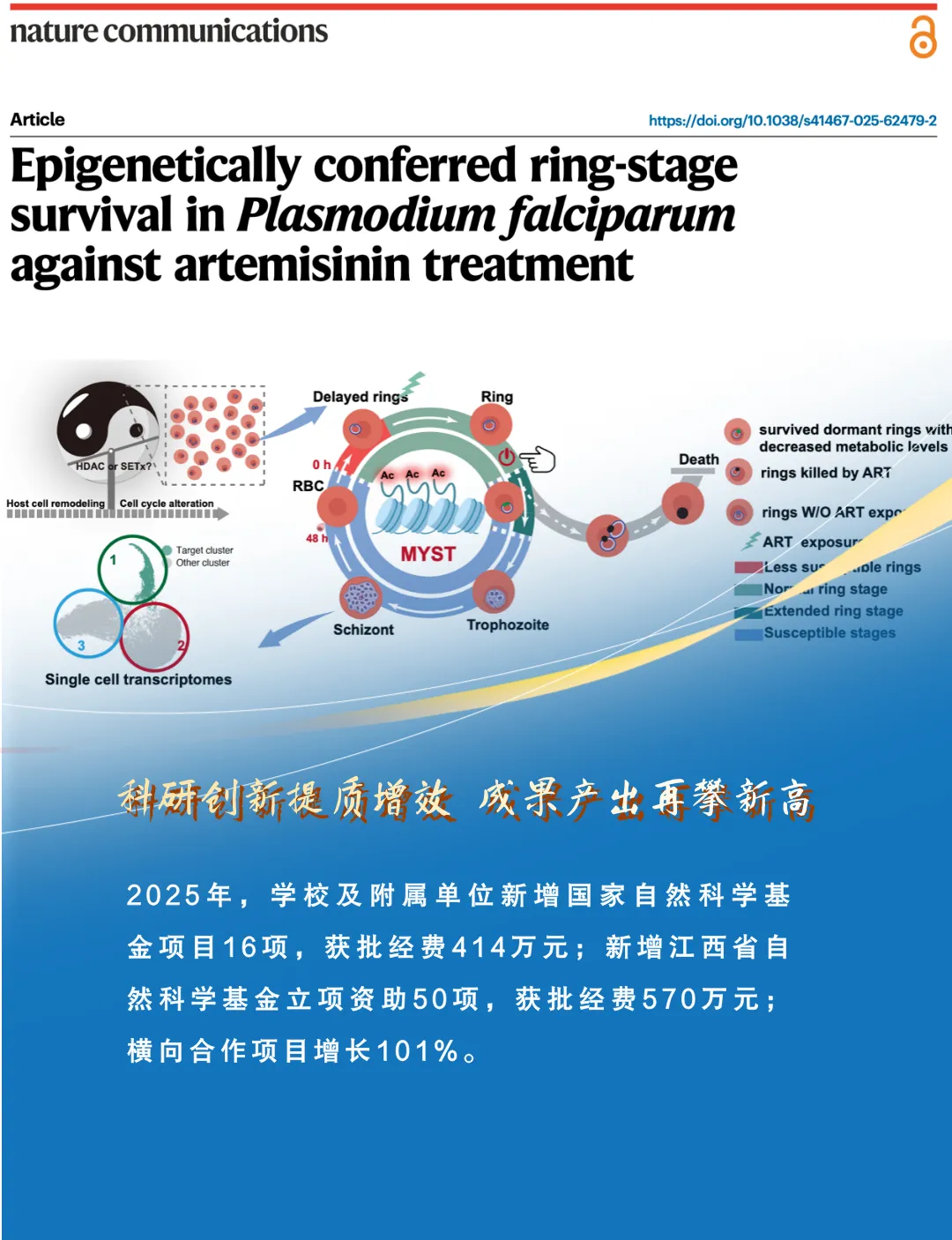 一年来,学校积极响应国家创新驱动发展战略,不断加强科研平台的建设和升级,扎实推进有组织科研。学校柔性引进人才张青锋教授在国际一流学术期刊《Nature Communications》(自然·通讯)上发表重要研究成果,学校基础医学院陈璇博士作为共同第一作者参与研究,该研究得到了国家重点研发计划、国家自然科学基金等项目的支持。学校附属医院荣获江西省科学技术奖6项,其中省科学技术进步奖一等奖1项、二等奖4项,省自然科学奖二等奖1项。目前,学校先后获批省级重点实验室3个,联合共建国家级和省部级平台8个,获批国家自然科学基金、江西省自然科学基金等省部级及以上科研项目464项,授权发明专利72项。