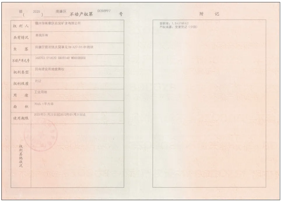受赣州市南康区众安矿业有限公司(以下简称“委托人”)委托,赣州金房拍卖有限公司定于2026年1月20日10:00开始在江西省公共资源数智交易平台综合产权交易系统通过网络竞价公开转让赣州市南康区镜坝镇太窝单元TW-A27-01-01地块使用权,现将有关事项公告如下:
