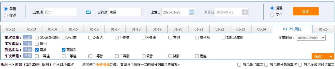 ▲1月26日抚州站至南昌西站车次