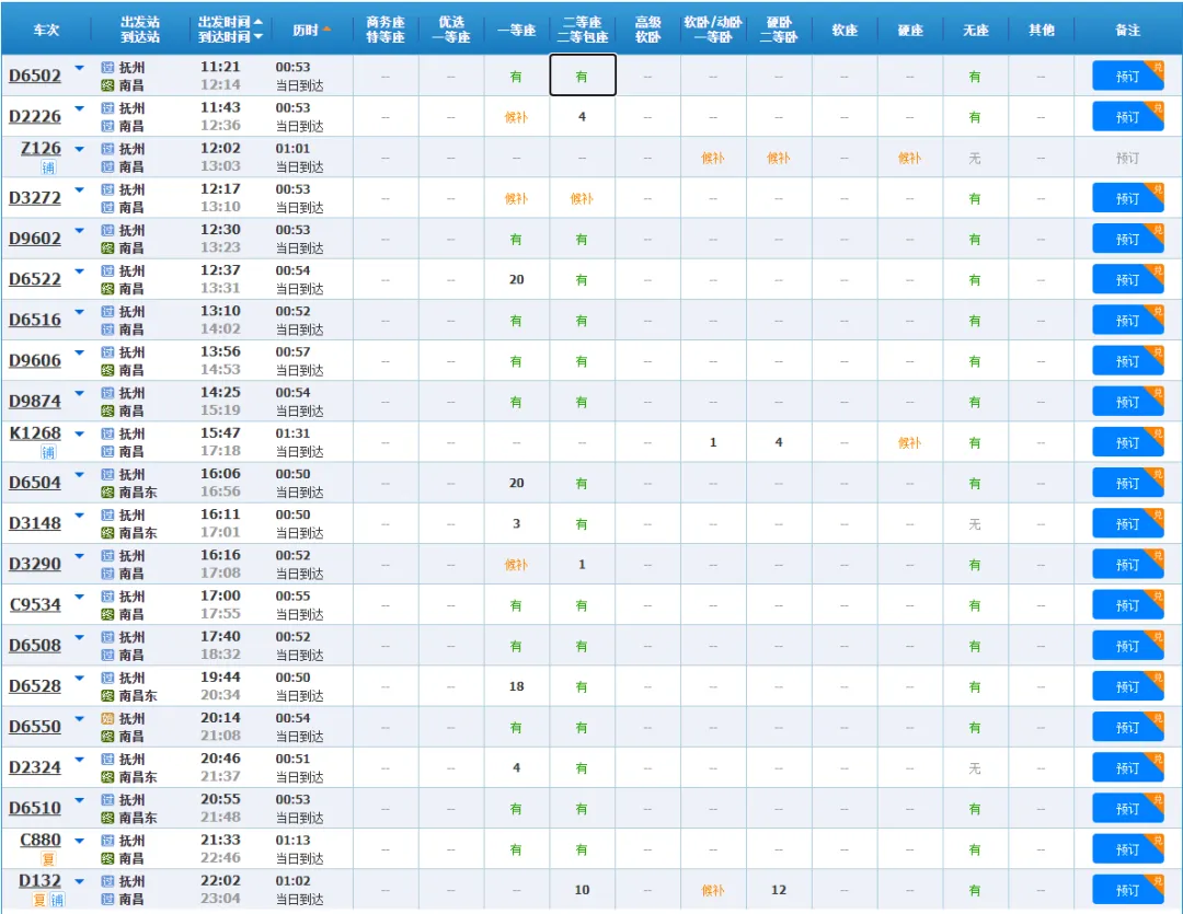 此前因施工暂时取消的抚州至南昌西直达车次,将正式回归,目前在中国铁路12306网站已经可以预定1月26日的抚州站至南昌西站的车票,具体车次如下: