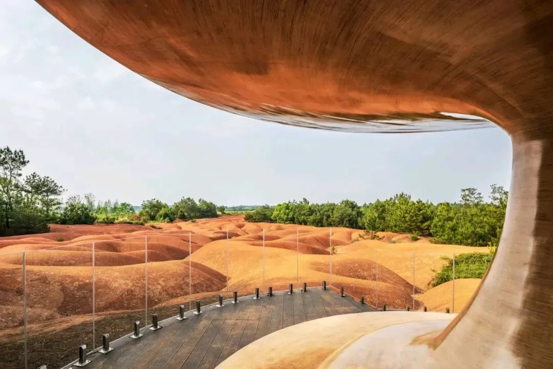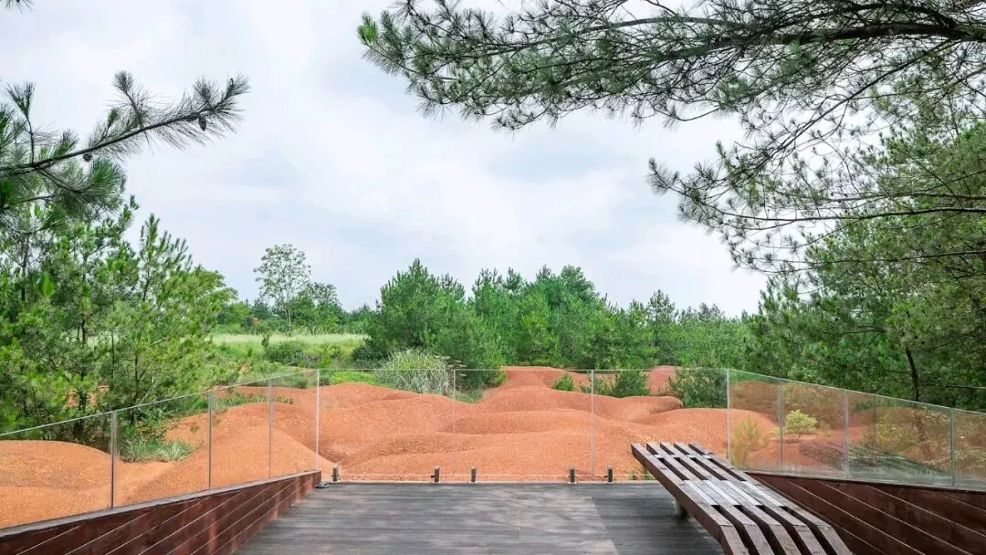 公园内,设计团队精心挑选视野开阔的地点,搭建了大小不一、朝向各异的观景平台。部分平台俯瞰壮丽的红土景观,部分平台则可远眺梅岭山脉。同时,公园还设置了“自然教室”,提供丰富的自然体验和环境教育机会,将现有林地与自然环境融为一体,让游客和学生在亲近自然的同时,了解和学习自然知识。