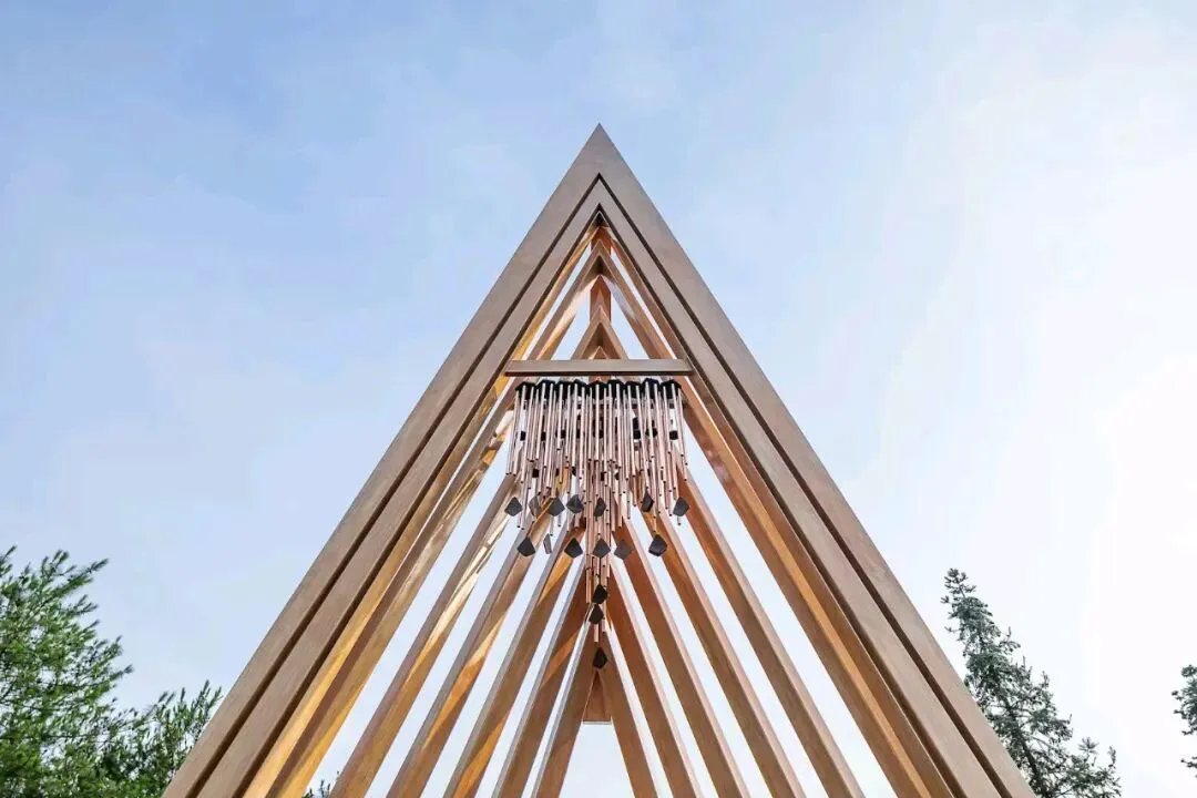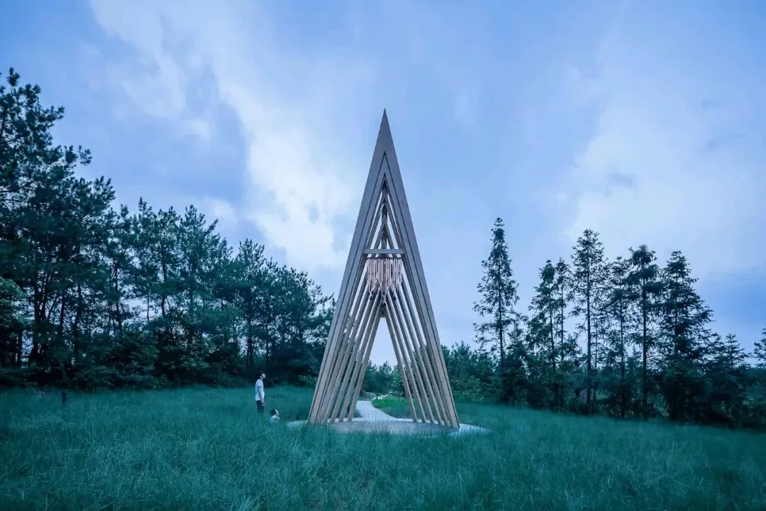 在公园内的一片草地上,设计团队打造了一个凉亭,供游客放慢脚步,聆听周围环境的声音,并与自然互动。4