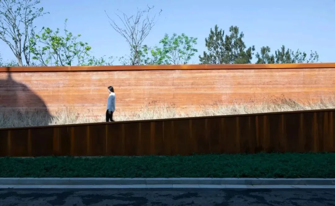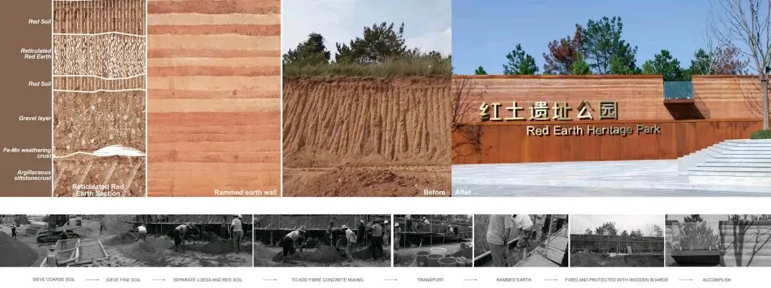 公园入口处内外高差达4米。峭壁展现出不同时期形成的网状红土层。受此启发,设计团队选择用网状红土在入口处建造了一道层叠夯土挡土墙。回归传统建造方式,展现了简约之美。