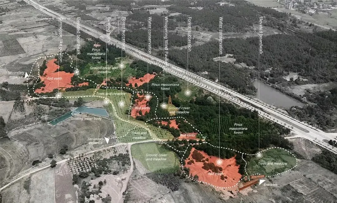 在森林演替过程中,引入刺槐、壳斗科植物等先锋物种和其他本地植物,并以斑块形式种植。随着时间的推移,这些不同物种的生长和竞争将逐渐改善土壤的pH值,从而使多样化且平衡的植被得以形成。该场地还将逐步过渡为适应当地亚热带气候的阔叶常绿林,从而为本地野生动物提供栖息地和繁殖地。