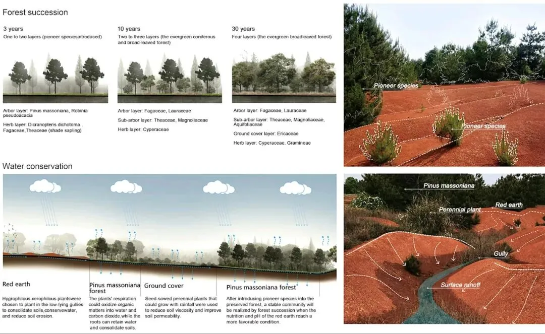 鉴于场地目前单一植被和土壤侵蚀的状况,提出了有针对性的森林演替和水资源保护作为生态重建策略。