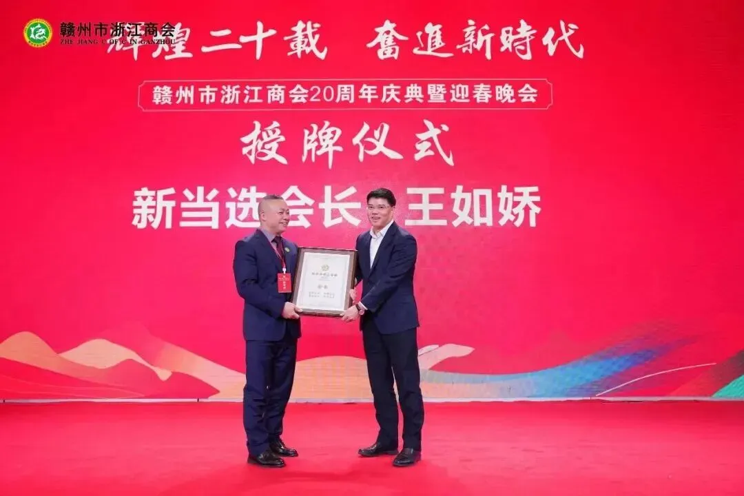 赣州市政协副主席刘春文亲自为当选会长王如娇、名誉会长陈岳林授牌,象征着信任与重托的传递。