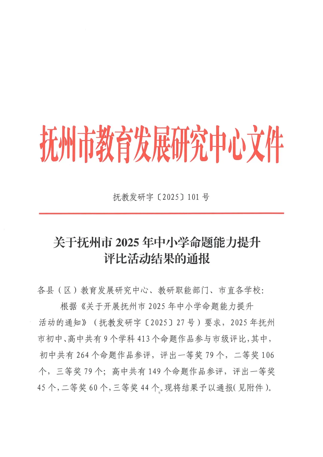 【抚州市】关于抚州市2025年中小学命题能力提升评比活动结果的通报