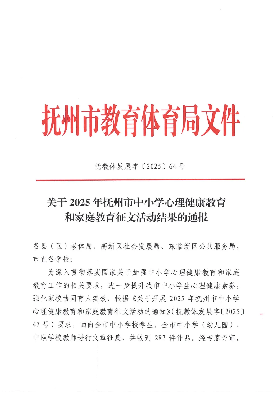 【抚州市】关于2025年抚州市中小学心里健康教育和家庭教育征文活动结果的通报
