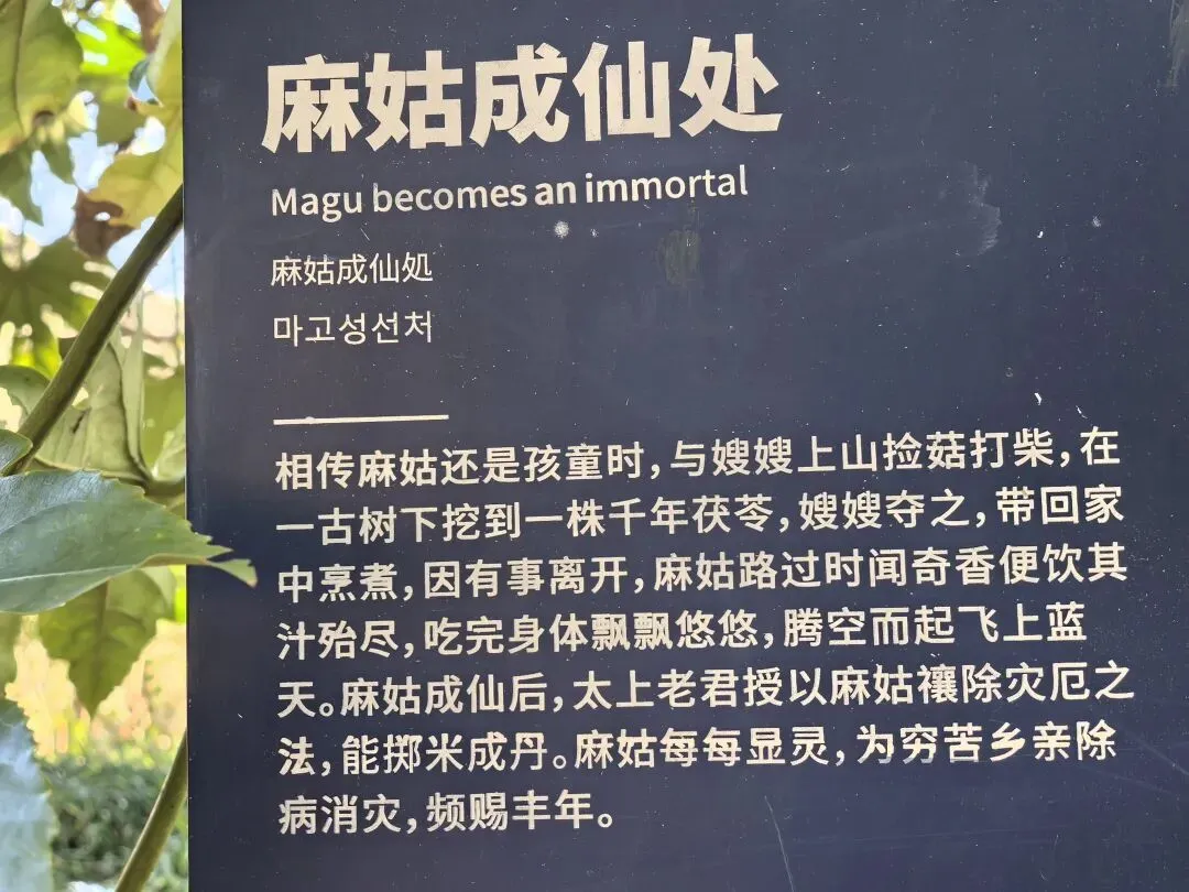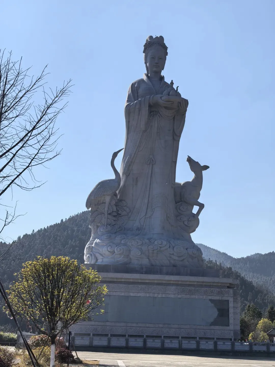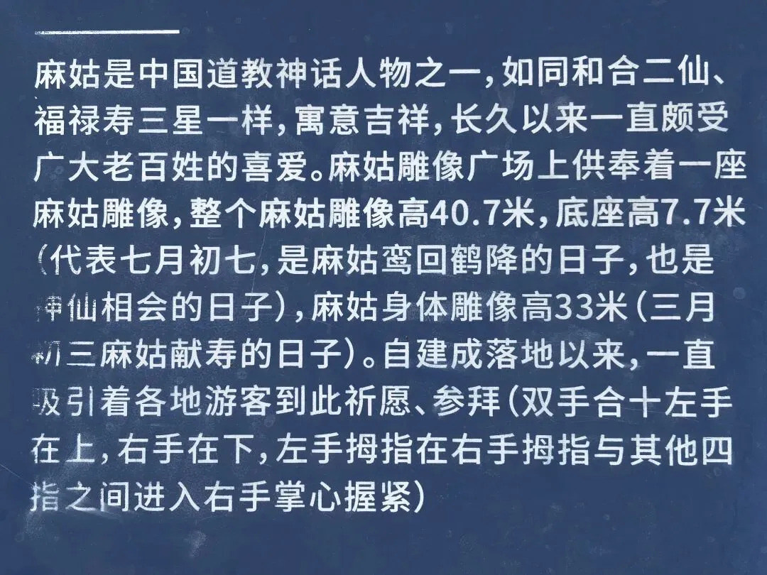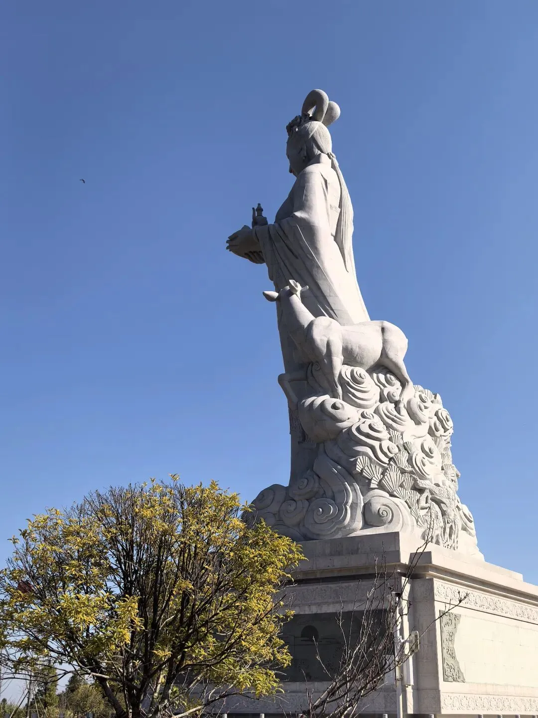 沿公路,再往里走一段,是新建的麻姑庙。庙后方,山顶平台上的麻姑塑像,耸立在群山之间,远远望去,有一种艺术的美感。