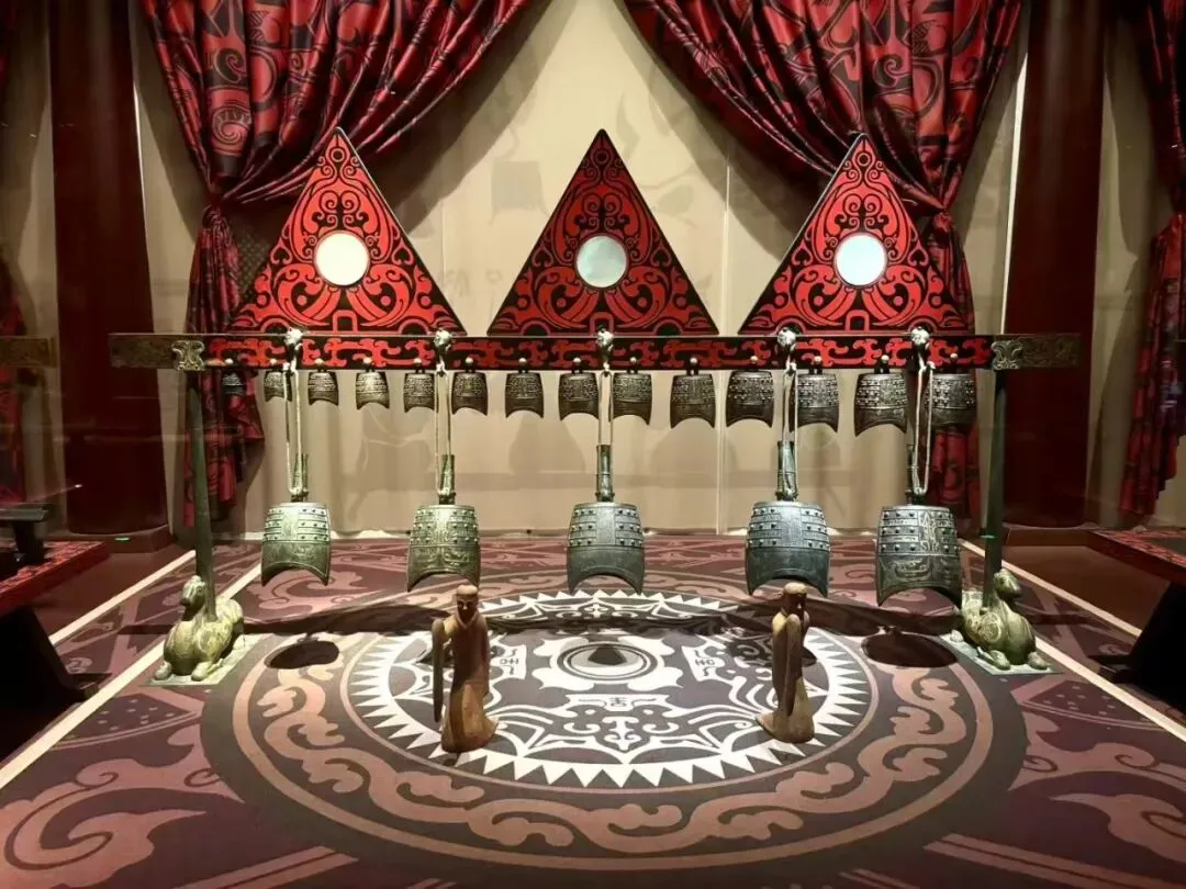 另一边,是静默无声的修养:中国考古发现最早、最完整的孔子画像漆器屏风,近万枚记载《论语》《礼记》的竹简,成套的编钟、琴瑟。
