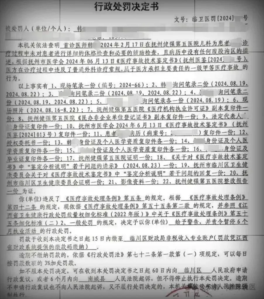 对此处理,患儿家属不满意,拿着鉴定报告直接报警,韩医生被警方刑拘。