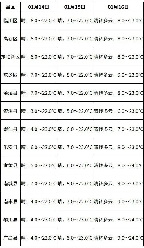 (2026-01-14)抚州市气象台6时发布天气预报:今天白天到晚上晴天,偏南风1到2级,最高气温22到23度,最低气温3到7度,明天白天到晚上晴天。天干物燥,请注意用火用电安全。