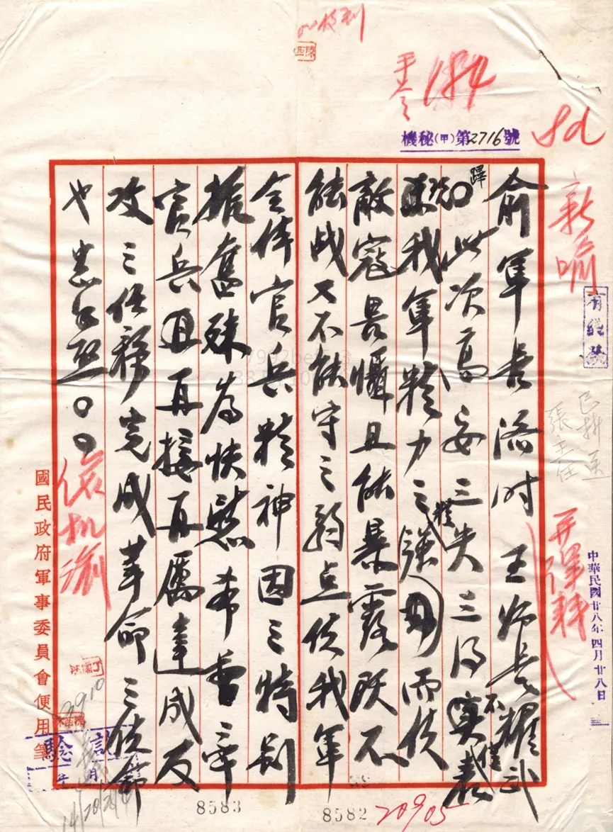 1939年4月28日,我军完全收复高安县城两天后,蒋中正致电俞济时、王耀武,电报原文如下: