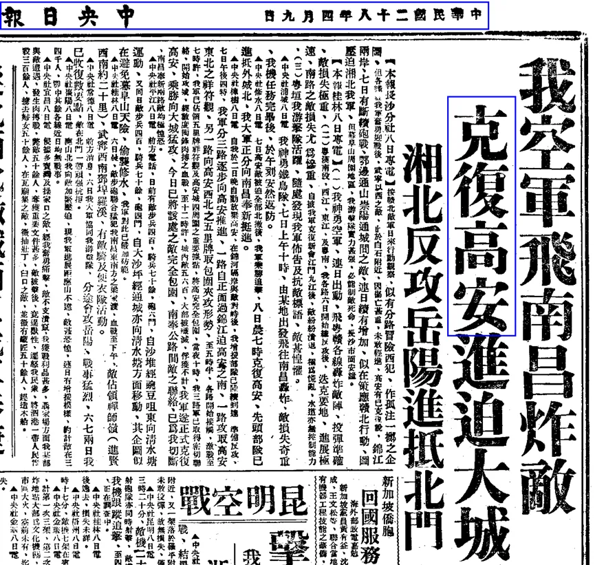 1939年4月9日《中央日报》克复高安报道