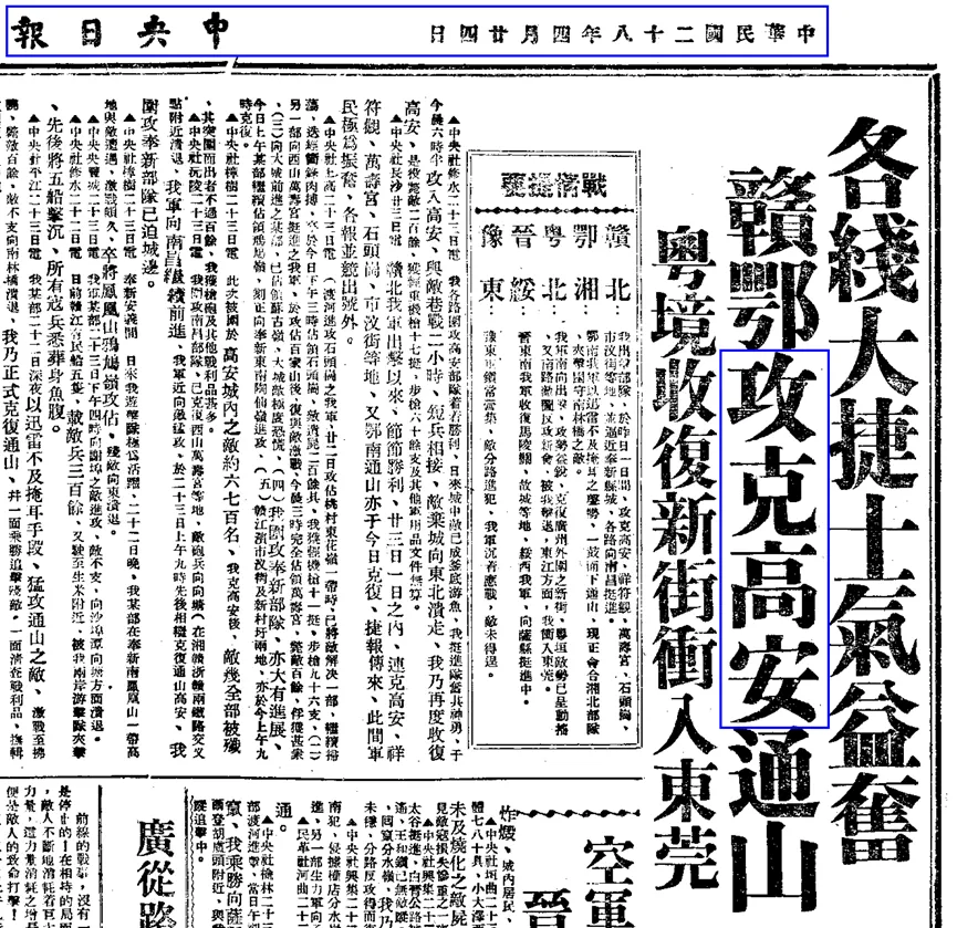 1939年4月24日《中央日报》攻克高安报道