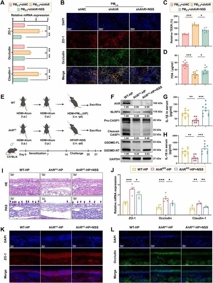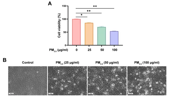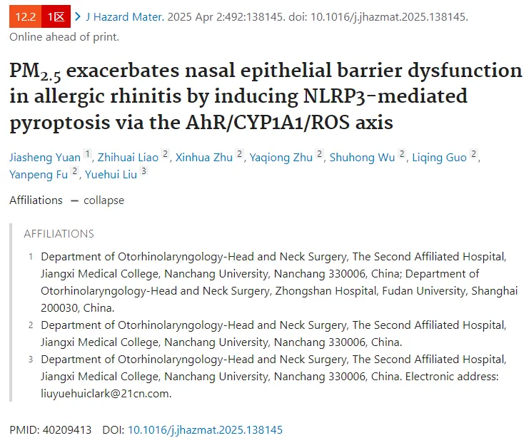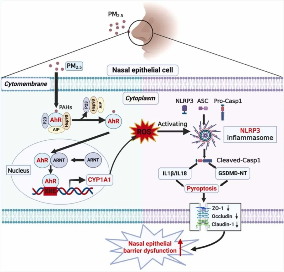 PM2.5是导致过敏性鼻炎的一个关键环境风险因素,主要是因为它能够破坏鼻上皮屏障,而鼻上皮屏障在维持黏膜稳态和保护呼吸道免受过敏原和病原体侵害方面起着至关重要的作用。在变应性鼻炎(AR)中,过敏原通过削弱紧密连接(TJs)破坏这一屏障,使过敏原得以渗透入鼻黏膜,从而导致免疫致敏和2型炎症反应。鼻上皮屏障损伤的程度与鼻部炎症的严重程度相关,并被认为是AR进展的关键标志。环境污染物,尤其是PM2.5,会加剧这种功能障碍,加重AR症状。然而,PM2.5在AR 中损害鼻上皮细胞并破坏屏障完整性的具体机制仍不清楚。