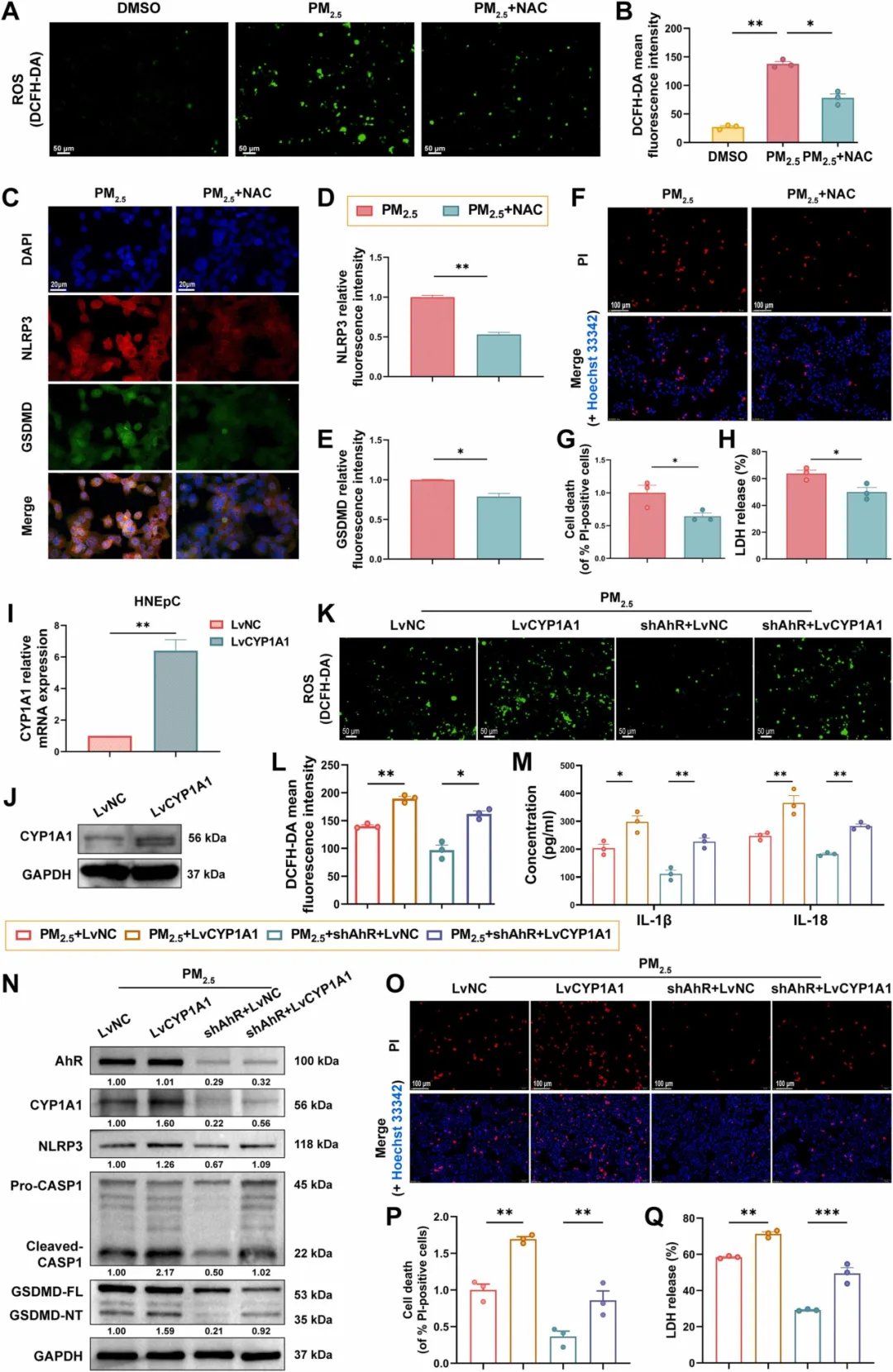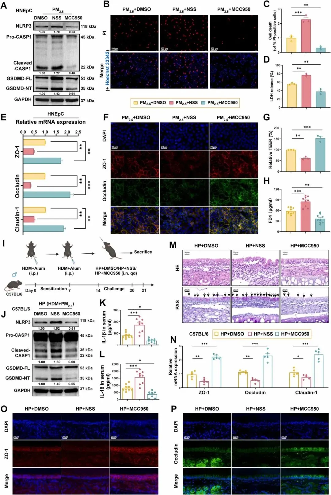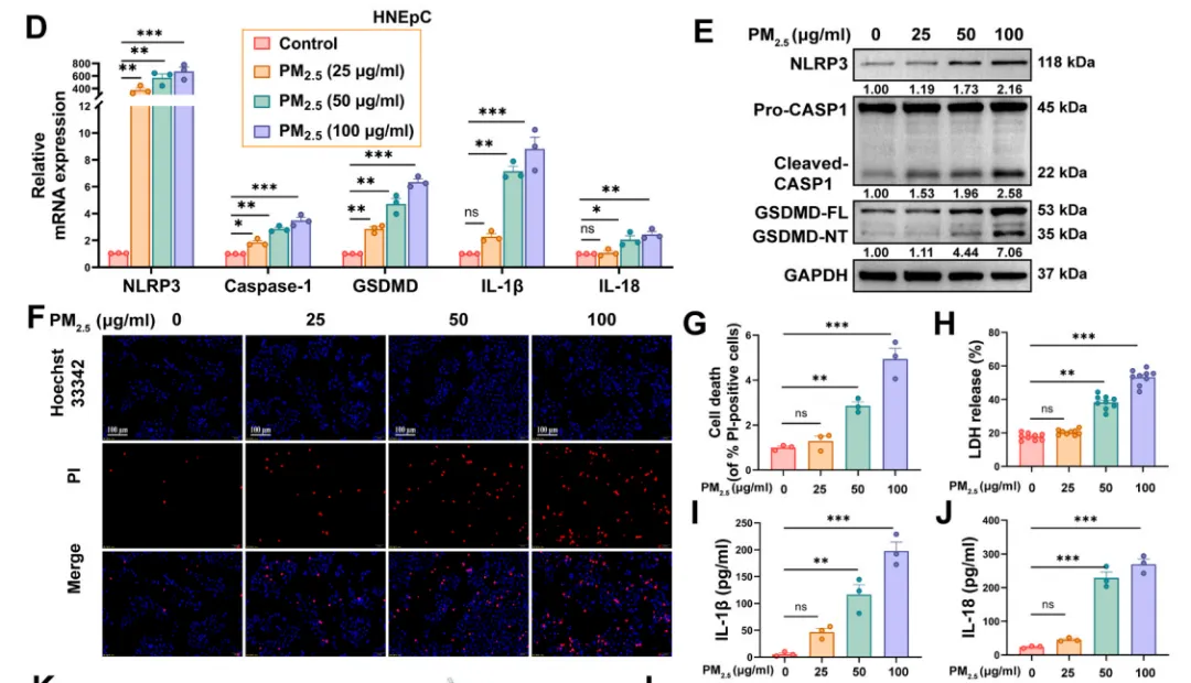 最新研究表明,细胞焦亡这种高度炎症性的程序性细胞死亡形式在上皮屏障功能障碍中起着关键作用。对特应性皮炎和克罗恩病等疾病的研究表明,细胞焦亡失调与上皮屏障功能障碍有关,抑制细胞焦亡可减轻组织损伤。此外,环境污染物如烟草烟雾和PM2.5可激活 NLRP3炎性小体,并诱导气道上皮细胞发生细胞焦亡。尽管近年来有关细胞焦亡在气道炎症中作用的研究有所增加,但PM2.5诱导的鼻上皮细胞细胞焦亡对鼻上皮屏障功能的直接影响及其具体分子调控机制仍不清楚。