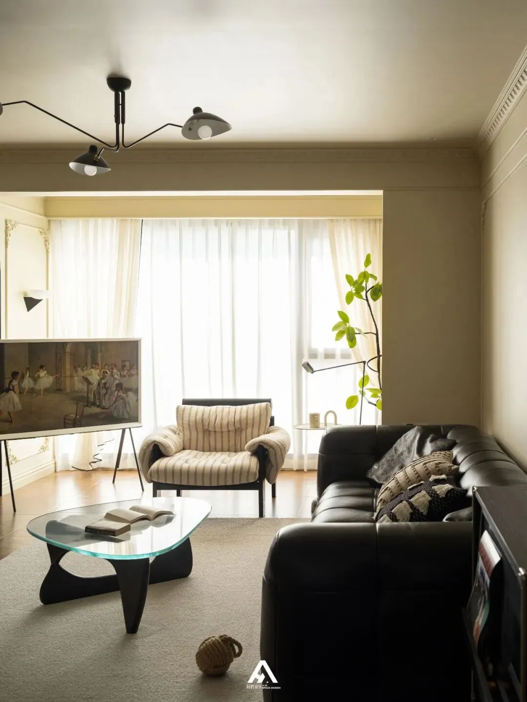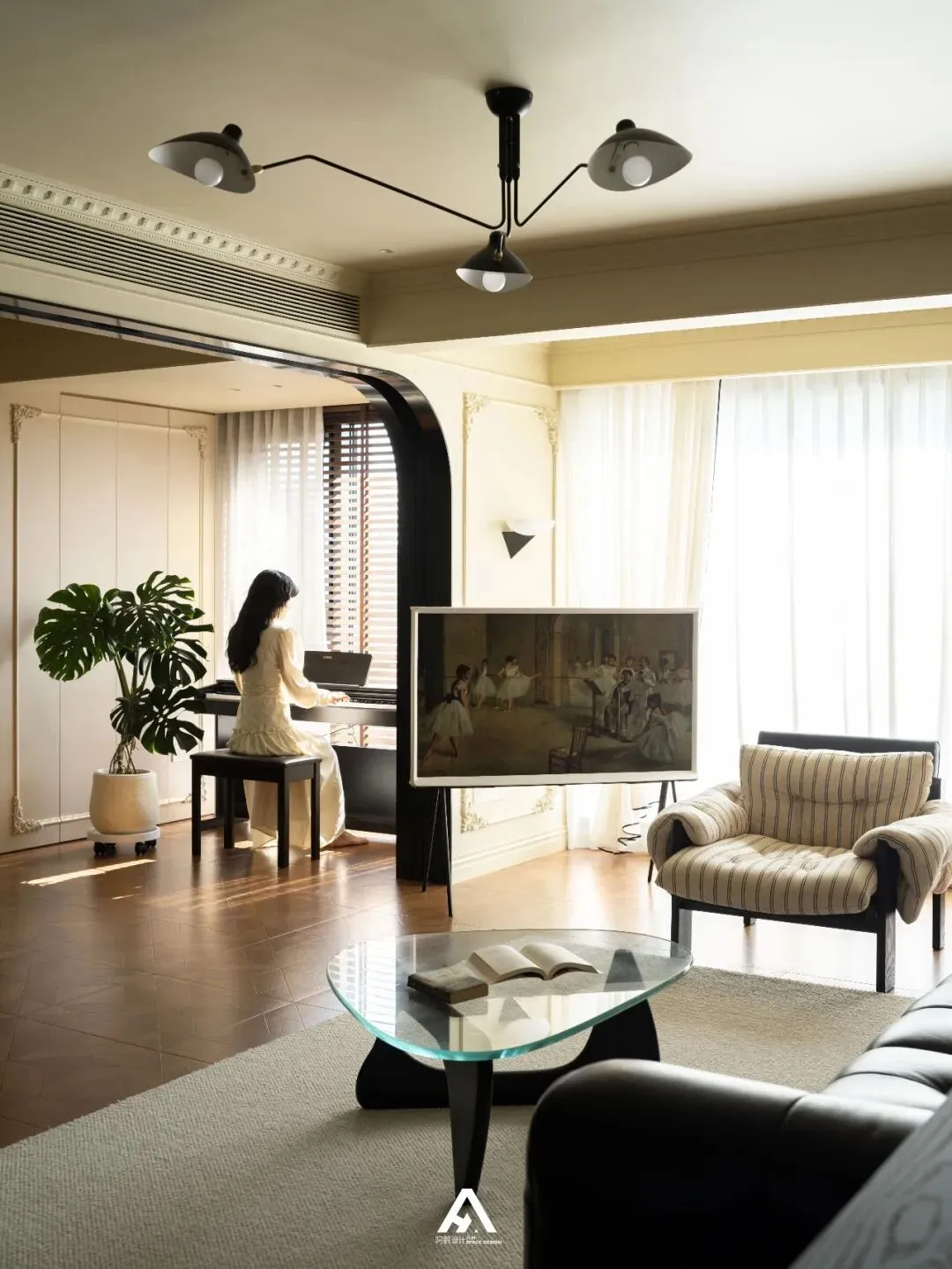 复古格子玻璃门是一种法式经典的设计元素,为空间增添了一份浪漫与怀旧的氛围,还能够在空间中引入自然光线,增强通透感和设觉开阔感。留有一定的空和呼吸感。“三星Serif画镜”电视单纯的摆放在那就像一幅画,斜放后真的很美,弱化了传统空间格局,让没有背景墙的家多了一份随性。