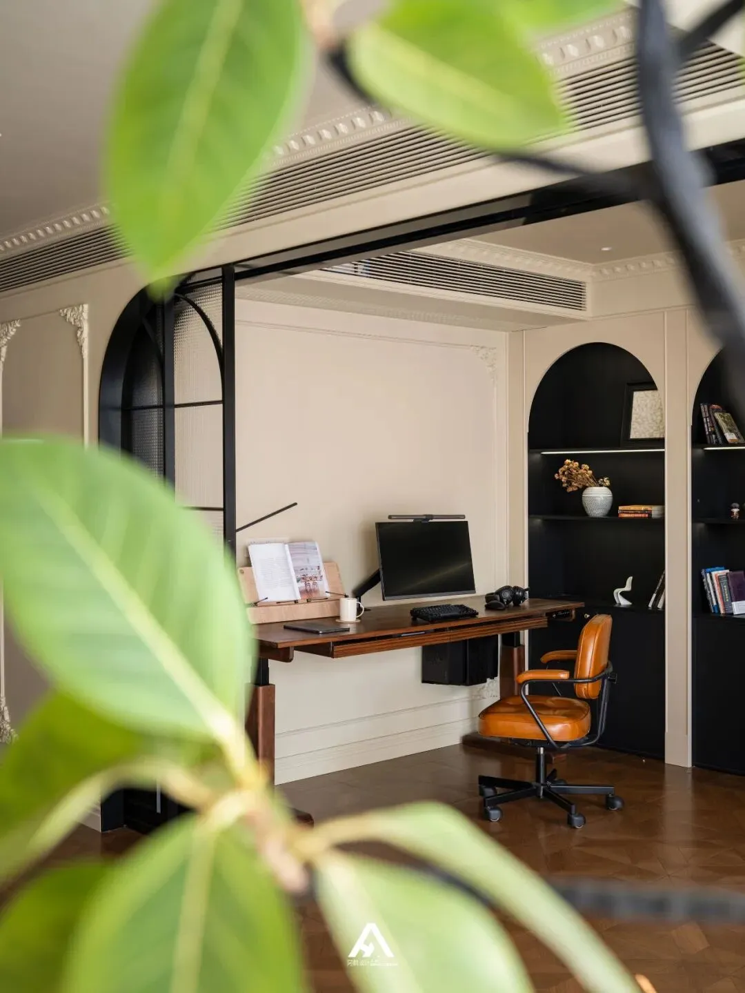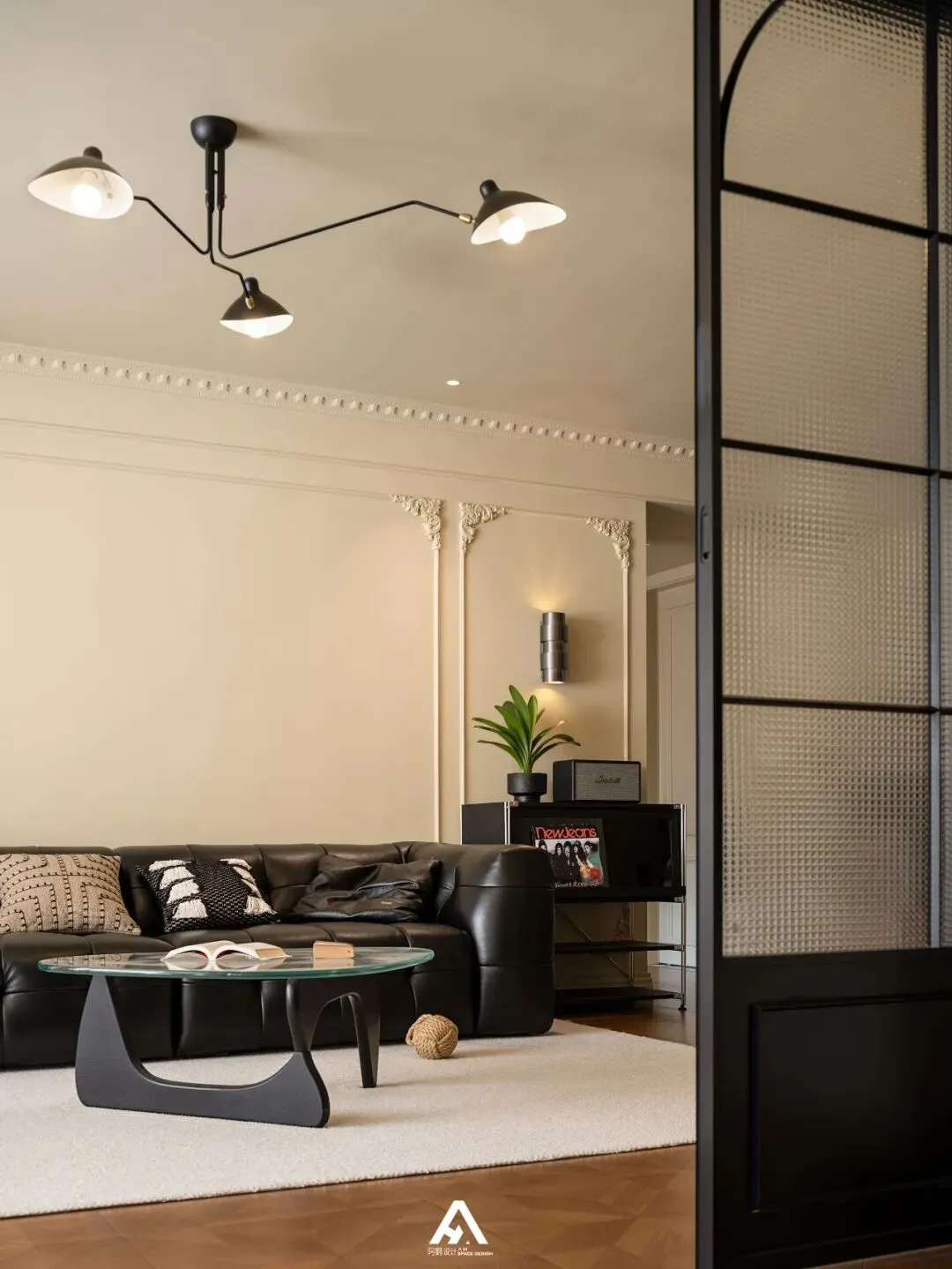 秩序后的空间和走道之间可分可和,一扇双推拉门直通客厅,推开复古格子玻璃门,客厅采光极佳,摒弃低饱和度的奶油色系为主,营造了一股温柔又浪漫的基调,木纹砖通铺,沉稳木质调宁静沉稳。文艺又不失浪漫情怀的大叶绿植,让空间更富有腔调。