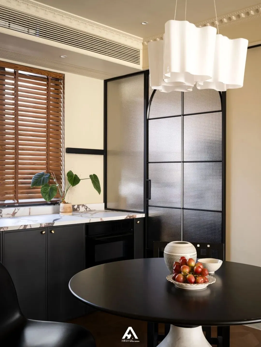 一扇玻璃移门在厨房和餐厅之间提供了灵活性和可调性。在这里,赋予居住者一个更加有亲和力和设计感的灵活空间。