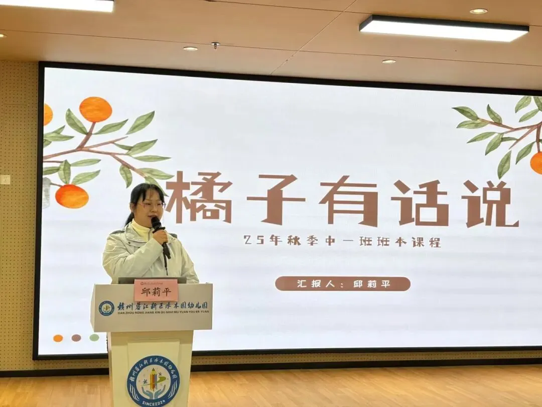 童问启智,橘韵育课。中一班邱莉平老师以《橘子有话说》为题,分享班本课程的实践故事。她从孩子们对园内橘子树的好奇切入,娓娓道来课程从萌发、推进到深化的完整脉络。课程中,孩子们观察橘子生长、采摘橘子果实、探究橘子奥秘,在沉浸式的亲身体验中收获成长的点滴美好。