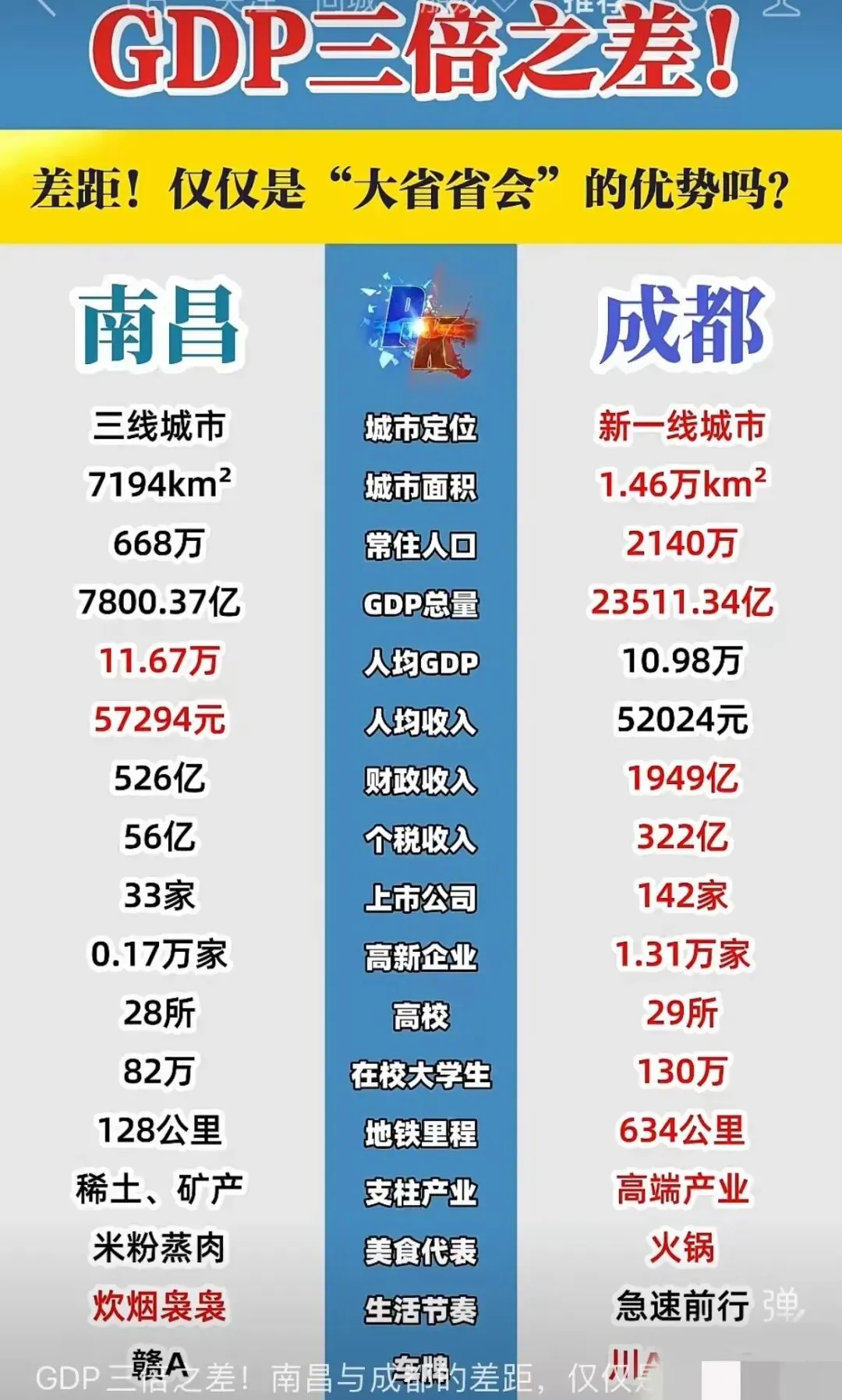 成都和南昌同为省会,差距着实惊人,成都实力已是南昌的三倍,人口还多了约1400万。