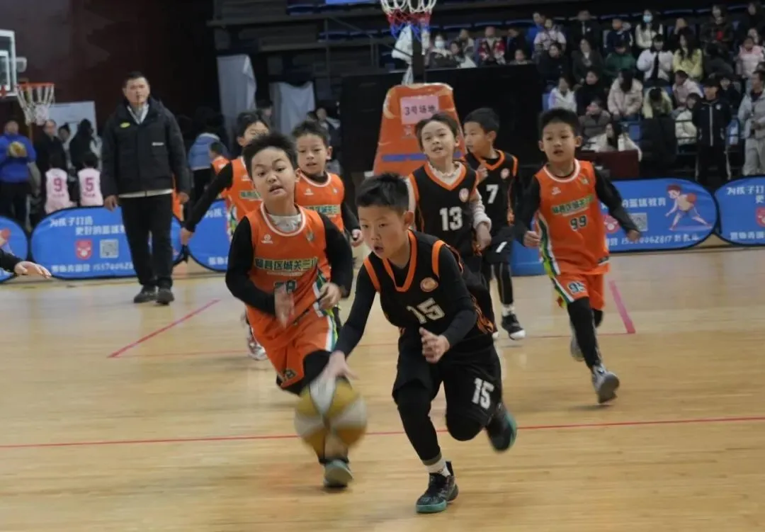 踏入小学组赛场,这里气氛明显不同,比赛节奏更快,对抗更激烈,战术也更加复杂多样。团队协作,防守相互呼应,补位及时。球员们灵活的脚步、快速的运球突破、巧妙的假动作过人,一次攻防转换瞬间点燃全场,成功抢断后迅速发起快攻,三四名小球员如潮水般涌向前场,几次精准传球后轻松上篮得分。这样的场景在小学组比赛中并不少见,展现了孩子们日益增长的篮球智慧。在这个阶段的赛场上,孩子们开始真正学习如何面对胜负。胜利后的击掌、失利后的拥抱与复盘,这些经历比技术磨练更为珍贵,它们是汗水的证明,更是成长的勋章,教会了孩子们在逆境中坚持、在顺境中专注,并始终保有对对手的尊重。
