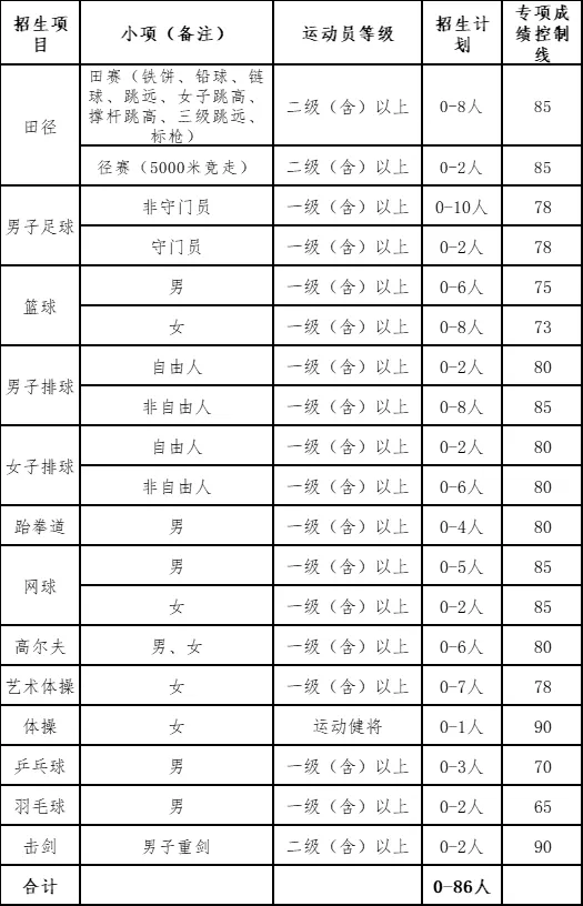 2.拟增加计划的项目顺序及数量为:男子排球(非自由人)2人、男子足球(非守门员)2人、女子排球(非自由人)1人、男子篮球2人、田径(田赛)2人、男子网球2人、女子网球1人、艺术体操1人、高尔夫2人、乒乓球1人、羽毛球1人、女子篮球2人、跆拳道1人。各项目计划一次性增加到位,如项目二志愿无有效生源或有效生源不足,则不增加或按实际有效生源数增加计划。