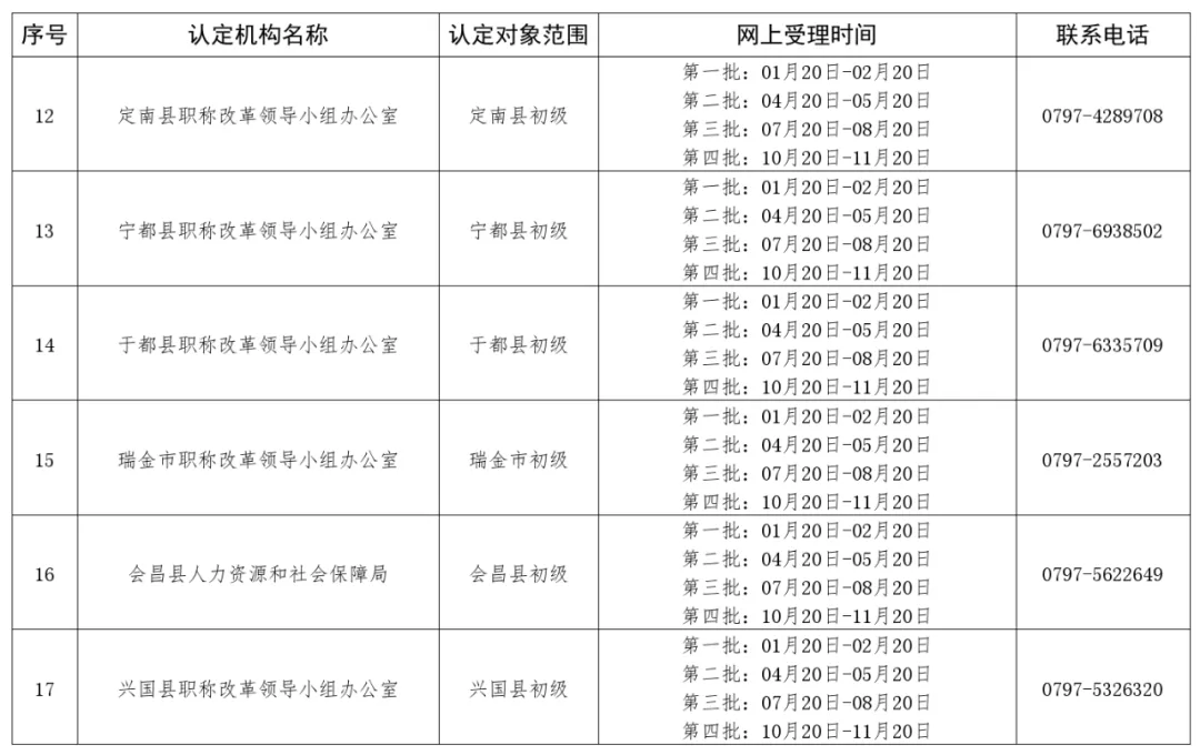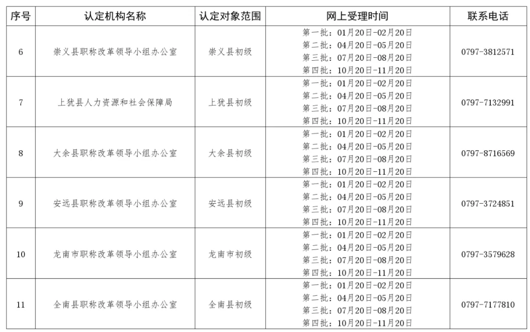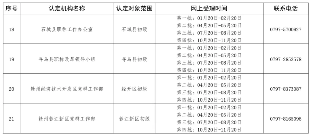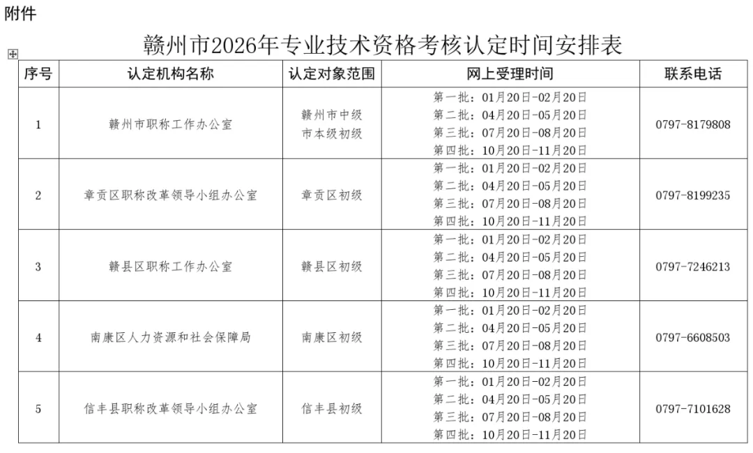 根据《江西省职称考核认定办法》(赣人社规〔2025〕3号)、《关于做好专业技术资格考核认定工作的通知》(赣人社字〔2019〕154号)及相应系列(专业)职称申报条件有关要求,为做好全市2026年度专业技术资格考核认定工作,现将有关事项明确如下: 一、申报时间 专业技术资格考核认定工作每季度开展一次(具体时间详见附件),自主评审单位自行确定考核认定时间,在考核认定工作开展前,根据认定权限提前向同级职称部门以书面形式报备。申报人员应在规定的时间内按要求上传材料,逾期不予受理。 二、申报方式 专业技术资格考核认定使用“江西省职称申报评审系统”(网址https://hr.jxhrss.gov.cn/zcxt),实行网上申报、审查、认定、发证、查询,申报人员、用人单位、主管部门、人社部门均须使用系统。创建组织机构和申报人员个人账号、认定机构认定范围按照《关于做好专业技术资格考核认定工作的通知》(赣人社字〔2019〕154号)要求执行。 三、认定条件 考核认定学历资历等条件按相关系列(专业)职称申报条件和《江西省职称考核认定办法》(赣人社规〔2025〕3号)执行,重点把握以下几点: (一)申报人员应具备各系列专业技术资格考核认定最低学历要求,高校(教学)、高职(教学)、中职(教学)、党校、社会科学、自然科学(研究)、新闻记者、新闻编辑最低学历要求本科以上。 (二)从事专业与所学专业不相同或不相近的,其专业技术工作年限相应延长1年后,可按其从事专业申请相应系列(专业)职称考核认定。 (三)根据《江西省深化中等职业学校教师职称制度改革实施意见》(赣人社字〔2022〕267号)要求,各职业高中、职业教育教研机构教师职称评聘不再参加中小学教师系列及其他系列职称评审。 (四)申报人员无需上传社保参保缴费证明,只需在系统“相关材料证明”栏中选择“个人社保参保缴费证明”,系统将自动关联社保参保信息。当前职称申报单位和参保单位名称一致。当前职称申报单位和参保单位名称不一致的,须在“其他”栏中上传职称申报单位和参保单位隶属关系证明,并加盖两者公章的附件。 不在我省企事业单位从事专业技术工作,但其人事档案在我省各级就业创业公共服务部门(原人才流动中心)托管的专业技术人员,其社保缴纳未达到上述要求的,由地方人社部门认真核实其相关信息,报市职称办统一汇总后,经省职称办同意,组织申报。 (五)有从业准入要求的专业技术资格,须先取得相应的从业资格,方可考核认定相应专业技术资格。 (六)已实行“以考代评”专业技术资格,不得实行考核认定;非国有企业工程专业技术资格不组织考核认定。 (七)申报人员,其学历、学位、资历(资格、聘任时间)、工作年限等终算时间第一批为2026年3月31日,第二批为2026年6月30日,第三批为2026年9月30日,第四批为2026年12月31日,时间按周年计算。 (八)如相关系列(专业)职称申报条件的要求与《江西省职称考核认定办法》(赣人社规〔2025〕3号)不符的,以最新的政策为准。 四、有关要求 (一)鼓励我市符合条件的链主企业(龙头企业)和新型研发机构根据《江西省链主企业和新型研发机构职称自主评审服务管理办法》相关要求申请开展职称自主认定。 (二)各级申报单位、主管部门、人社部门要实名创建“领导审查”和“经办人审查”账号,且“领导审查”和“经办人审查”不能为同一人,如单位领导或经办人有调整的,应及时更改“领导审查”或“经办人审查”信息。申报人员不得以“领导审查”和“经办人审查”的身份审查本人的材料。 (三)申报单位在给申报人员创建申报账号时,申报人员的身份信息应与社保信息一致,身份证尾号有字母的要设置为大写字母,否则将无法链接社保参保信息;申报人员的申报材料要扫描或拍摄原件上传,复印件需经申报单位核实背书“与原件相符”,审核人签字后加盖申报单位公章;在申报单位工作之前有专业技术工作经历的,需在申报系统“相关证明材料”中的“其它”栏上传相关工作佐证材料。 (四)要按照人社部《职称评审监管暂行办法(人社部发〔2024〕56号)、市人社局《关于加强专业技术资格评审工作纪律的通知》(赣市人社字〔2018〕113号)和《关于进一步明确职称申报资格条件审查职责的通知》(赣市人社字〔2018〕211号)等文件有关要求,严格落实审查、推荐责任追究制度,对审查把关不严的单位和个人进行通报批评,对申报人员弄虚作假、暗箱操作等违纪违规行为,取消申报资格并列入“黑名单”。 (五)对工作经历和业绩成果等方面有明确要求的系列(专业),按照《关于进一步明确职称申报资格条件审查职责的通知》(赣市人社字〔2018〕211号)明确的职责,由用人单位(人事代理机构)及其主管部门负责审查工作经历和业绩成果等方面是否符合申报条件,不符合申报条件的不得申报。 (六)要强化政策宣传力度,重点面向企业开展精准宣讲。各县(市、区)要通过进企业、进园区等多样化形式,对相关政策进行深度解读,引导并支持企业符合条件的人才申报对应职称认定。 (七)各县(市、区)及自主评审单位务必于2026年12月31日前完成2026年度考核认定工作,并将专业技术资格考核认定的批复文件和考核认定通过人员证书信息(从职称申报评审系统证书管理中导出excel表格)上报市职称办。批复文件应按“江西省职称申报评审系统”生成的
