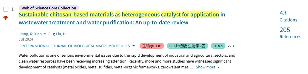 2024年06月08日,国际期刊《International Journal of Biological Macromolecules》发表了阳光净水课题组题为“Sustainable chitosan-based materials as heterogeneous catalyst for application in wastewater treatment and water purification: An up-to-date review”综述论文。根据Web of Science检索,这是国际上首篇全面论述壳聚糖基异相催化剂在废水处理和水净化中应用的综述性论文。本综述概述了金属氧化物/壳聚糖基复合材料(MOs@CSbMs)、金属硫化物/壳聚糖基复合材料(MSs@CSbMs)、铋基半导体/壳聚糖基复合材料(BibSCs@CSbMs)、金属有机框架/壳聚糖基复合材料(MOFs@CSbMs)和纳米零价金属/壳聚糖基复合材料(NZVMs@CSbMs)等5种Cat@CSbMs材料的制备策略及作为助催化剂、光催化剂、类芬顿试剂在处理各类废水中的应用进展。该综述不仅加深了对环境功能材料与环境污染控制作用的理解,也为未来Cat@CSbM在污染物吸附和富集、光催化氧化降解污染物和还原金属离子等相关领域的研究提供了参考和启示。该论文自2024年6月发表以来,现已被引用43次(Web of Science),2025年5月起入选ESI高被引论文。