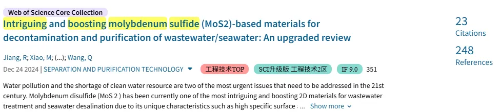 2024年12月24日,国际期刊《Separation and Purification Technology》发表了阳光净水课题组题为 “ Intriguing and boostingmolybdenumsulfide (MoS2)-based materials for decontamination and purification of wastewater/seawater: An upgraded review”综述论文。本综述全面总结了近6年(2018-)MoS2基材料(MoS2bMats)提高废水处理和水净化的有效改性策略,并重点阐述了MoS2bMats在环境污染物吸附、光催化降解和还原、Fenton高级氧化、PMS/PS活化氧化、废水脱盐(膜过滤和太阳能蒸发脱盐)等方面的应用。最后,讨论并提出了MoS2bMats理论研究与应用之间存在差距、工程挑战、未来的研究方向和机遇。该论文自2024年12月线上发表以来,现已被引用23次(Web of Science)。2025年06月,国际期刊《International Journal of Biological Macromolecules》发表了阳光净水课题组题为“Sustainable chitosan-based adsorbents for phosphorus recovery and removal from wastewater: A review”最新综述论文。本文全面综述了用于废水中磷回收和去除的壳聚糖基吸附材料(CSMats)的性质、改性方法、影响因素。同时,总结了CSMats吸附去除水体磷的主要作用机理(氢键、静电作用、路易斯酸碱相互作用、配体/离子交换和表面沉淀作用)。此外,还归纳了CSMats的再生方法、连续流处理和在实际废水中应用。最后,讨论了CSMats除磷材料面临的挑战和未来发展方向。《International Journal of Biological Macromolecules》主要聚焦于天然大分子的化学改性及其在生物、环境、制药、食品等领域的工业应用,2025年6月最新影响因子/中科院分区:8.50/TOP期刊。该论文自2024年1月线上发表以来,现已被引用8次(Web of Science),国际引用占比75%。
