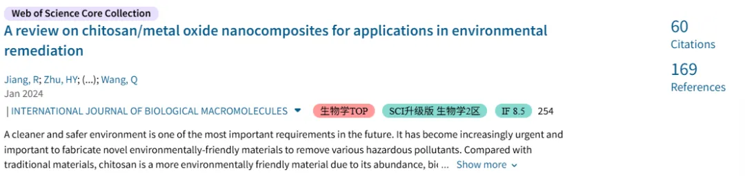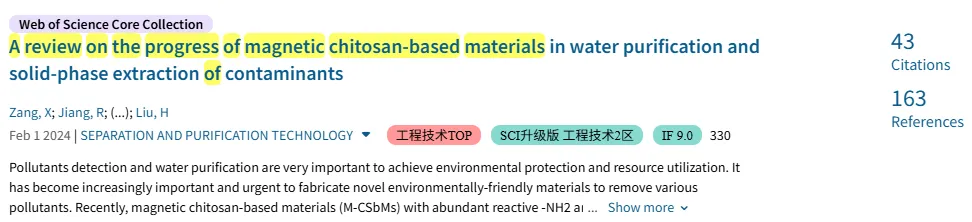 2024年1月,国际期刊《International Journal of Biological Macromolecules》期刊发表了阳光净水课题组题为“A review on chitosan/metal oxide nanocomposites for applications in environmental remediation“的综述性论文。更清洁、更安全的环境是未来最重要的要求之一。与传统材料相比,壳聚糖具有丰富的生物相容性、生物降解性、成膜能力和亲水性,是一种更环保的功能材料。由于壳聚糖分子链上丰富的-NH2和-OH基团可以有效地与各种金属离子螯合,壳聚糖基材料作为金属氧化物纳米材料(TiO2、ZnO、SnO2、Fe3O4等)的多功能支撑基质具有巨大的潜力。近年来,许多壳聚糖/金属氧化物纳米材料(CS/MONM)作为吸附剂、光催化剂、非均相类芬顿试剂和传感器,在环境修复和监测中具有潜在和实际的应用。本综述全面分析和总结了CS/MONMs复合材料的最新进展,这将为CS/MONMs复合材料的制备和废水处理应用提供丰富而有意义的信息,并有助于研究人员更好地了解CS/MONMs复合材料在环境修复与监测中的潜力。该论文自2024年1月线上发表以来,现已被引用59次(Web of Science),国际引用占比55.0%。2024年2月,国际期刊《Separation and Purification Technology》发表了阳光净水课题组题为“ A review on the progress of magneticchitosan-basedmaterials in water purification and solid-phase extraction of contaminants”的综述性论文。污染物检测和水净化对于实现环境保护和资源利用非常重要。构建新型功能材料去除各种污染物也变得越来越重要和紧迫。本综述总结了磁性壳聚糖(M-CSbMs)的3种可靠制备策略(原位策略、两步策略和沉积后策略),并详细介绍了M-CSbMs在有效吸附/光催化去除污染物(如重金属离子、有机染料、抗生素和其他污染物)和磁性固相萃取超低浓度污染物等方面的研究进展。最后,提出了M-CSbMs目前面临的挑战和前景,以期促进其在水净化和固相萃取污染物方面的实际应用。该论文自2024年2月发表以来,现已被引用43次(Web of Science)。