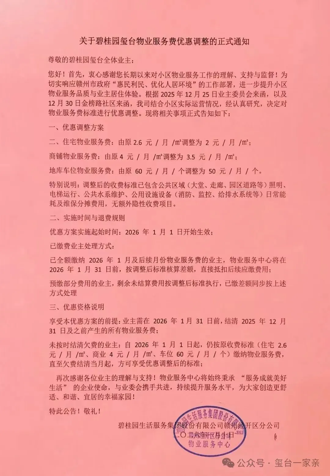 近日,碧桂园生活服务集团股份有限公司赣州经开区分公司发布《关于碧桂园玺台物业服务费优惠调整的正式通知》,适当下调了物业费收费标准。