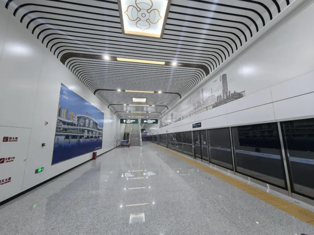 据悉,车站主体结构已完工,目前进入大面积装饰装修阶段。出站厅与部分站台层的装修已基本完成,标牌、灯光等设施已安装到位。机电安装工程完成约90%,装饰装修工程完成约50%。