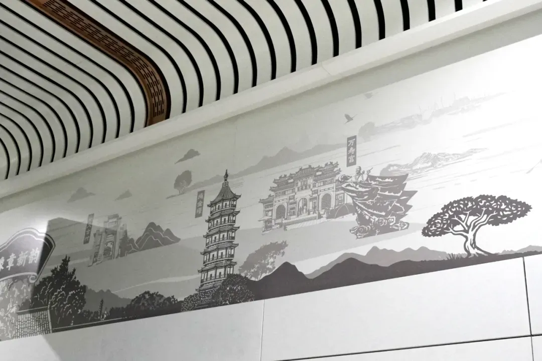 值得一提的是,站台安装了高铁屏蔽门,提升舒适与安全。屏蔽门上方有5幅融合南昌人文与红色文化的铝板转印画,如滕王阁、鄱阳湖、英雄城等。