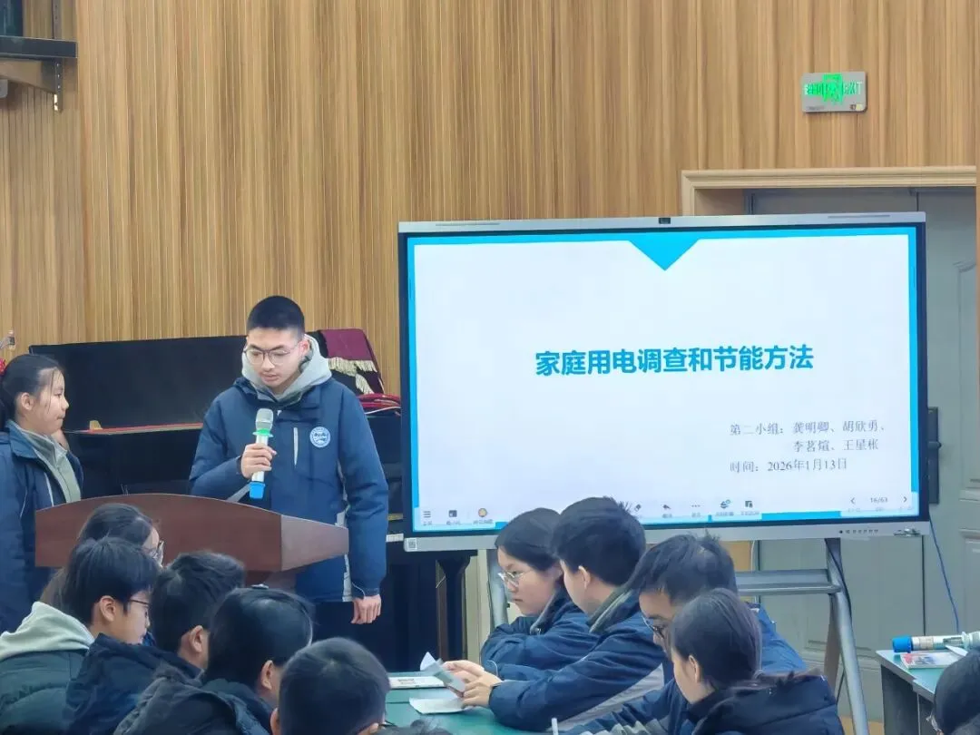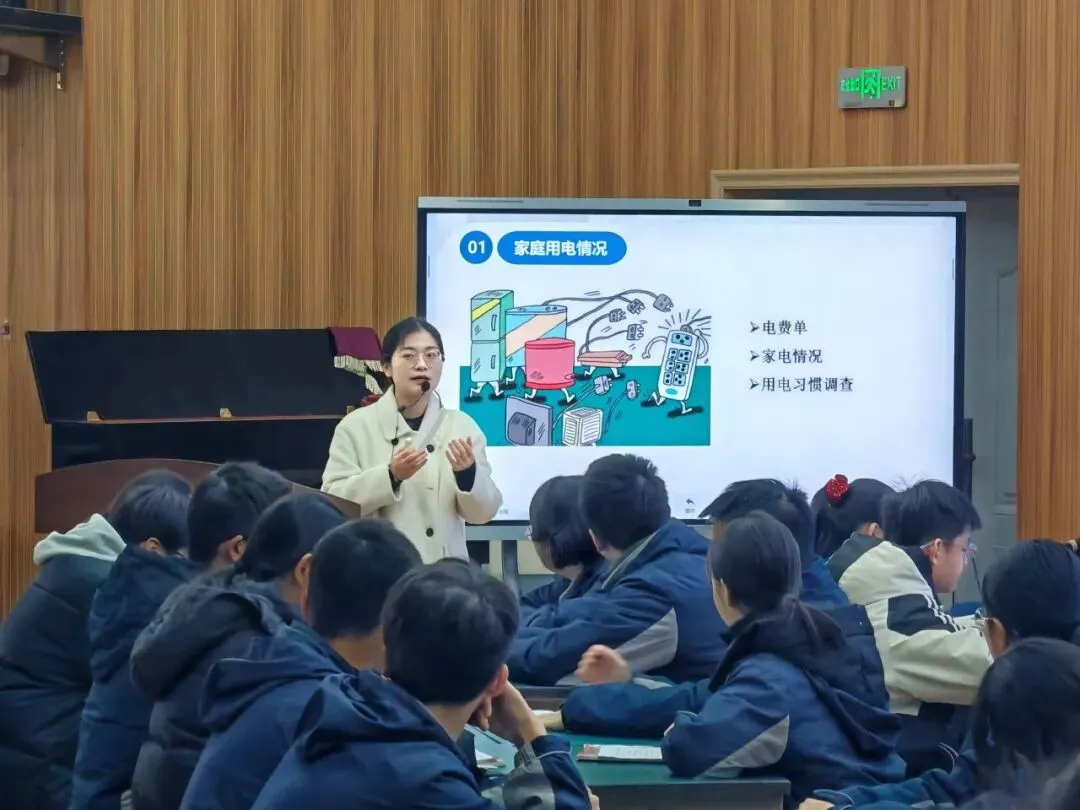 活动首先由南昌市外国语学校桃苑校区的周斯一老师带来的《家用电器节能与环保》的跨学科实践课。周老师老师巧妙构建了从“行为节能”到“技术节能”的认知阶梯。从学生分享的日常节能习惯出发,引导学生归纳节能方法,再通过分组汇报“节能灯与白炽灯能耗对比”,“电暖器与空调能耗对比”,使学生深刻理解“提升能量转化效率”这一技术节能的本质。周老师进一步引导学生将课堂结论与国家能源结构转型战略相联系,生动阐释了个人技术选择所承载的环保价值与社会责任,真正实现了物理教学从知识传授到价值引领的跨越。