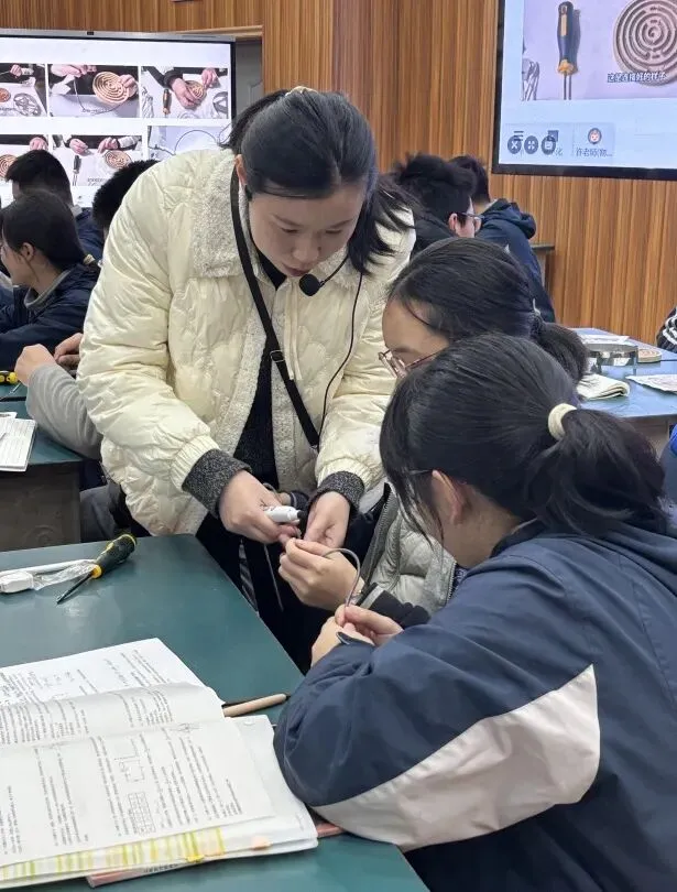 接着,南昌市站前路学校华侨城校区的许伊倩老师呈现了一节构思新颖的《电能与电功率》的习题复习课。许老师通过精心设计的阶梯式习题,引导学生自主梳理电能、电功、电热的关系,辨析在不同用电器中的能量转化形式,有效巩固了知识网络。除此之外,课堂后半部分还设计了“自制电炉盘”的学生实验。巩固了学生对电功公式、焦耳定律、电阻定律的深度理解与应用能力。在动手实践中,将抽象的“电能转化为内能”过程,转化为可触摸、可测量的具体作品,极大地激发了学习热情,培养了工程思维与解决真实问题的能力。
