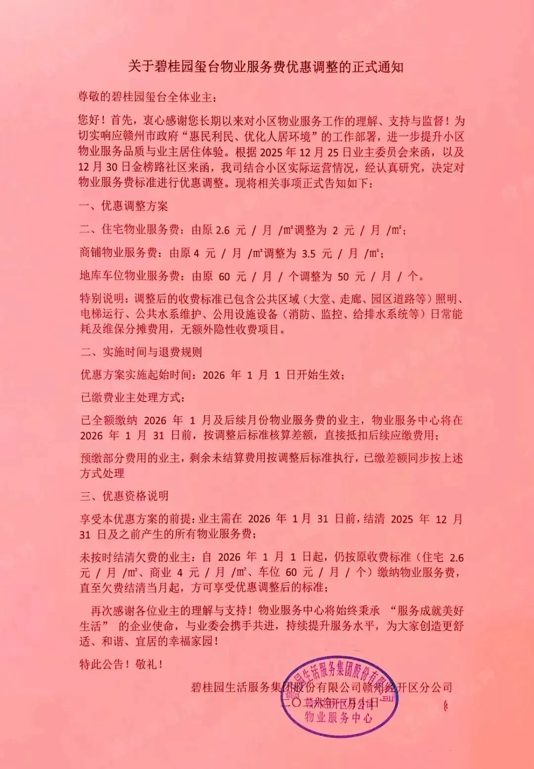 自碧桂园玺台小区业主委员会成立后,在金榜路社区的全程指导与监督下,业委会就物业费调整事宜与物业公司展开了多轮协商。2026年1月10日,碧桂园生活服务集团股份有限公司赣州经开区分公司正式发布《关于碧桂园玺台物业服务费优惠调整的通知》,对收费标准进行了适当下调。具体调整内容如下: