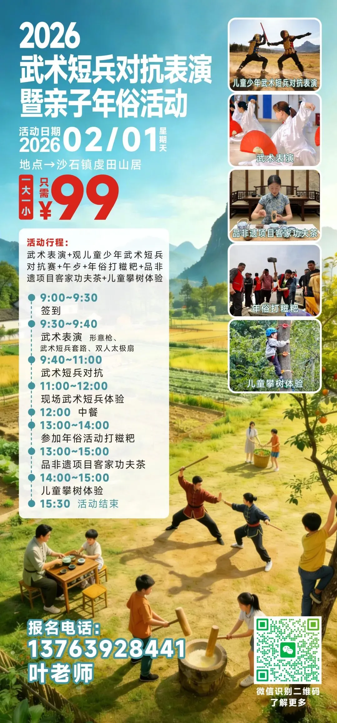 武术兵道原名“武术短兵”,是1979年和武术散打同时立项的竞技武术项目之一,发展已逾40年,是从传统武术提炼、传承出的重要内容。套路以徒手和器械演练为主,散打是徒手格斗,短兵则是器械格斗,3个竞技武术项目组成了传统武术精粹的完整版图。国家体育总局武术运动管理中心相关负责人表示,中国武术兵道承载着中华优秀传统武术文化,是中国武术协会整体发展战略的一个样板,是提升文化自信和国际传播力建设的有力抓手。手中有兵,心中有礼。武术兵道的吸引力不仅在于让武术回归对抗的本质,还在于它将中国传统人文精神与现代体育价值观在武术中巧妙融合。● 9:30~9:40 武术表演(形意枪、武术短兵套路、双人太极扇)出行方式:自驾,导航“虔田山居”可直达、市中心出发约25分钟左右车程报名电话:13763928441(叶老师)微信:ypc0044【报名费用】:99元/组/1大1小(加1大人加68元,加1孩子加38元)【费用包含】:短兵对抗表演+短兵对抗体验+午餐+年俗活动+非遗功夫茶体验+儿童攀树挑战;户外活动保险。- 活动自愿报名,户外活动安全第一,组织方会统一代理购买户外活动意外保险。