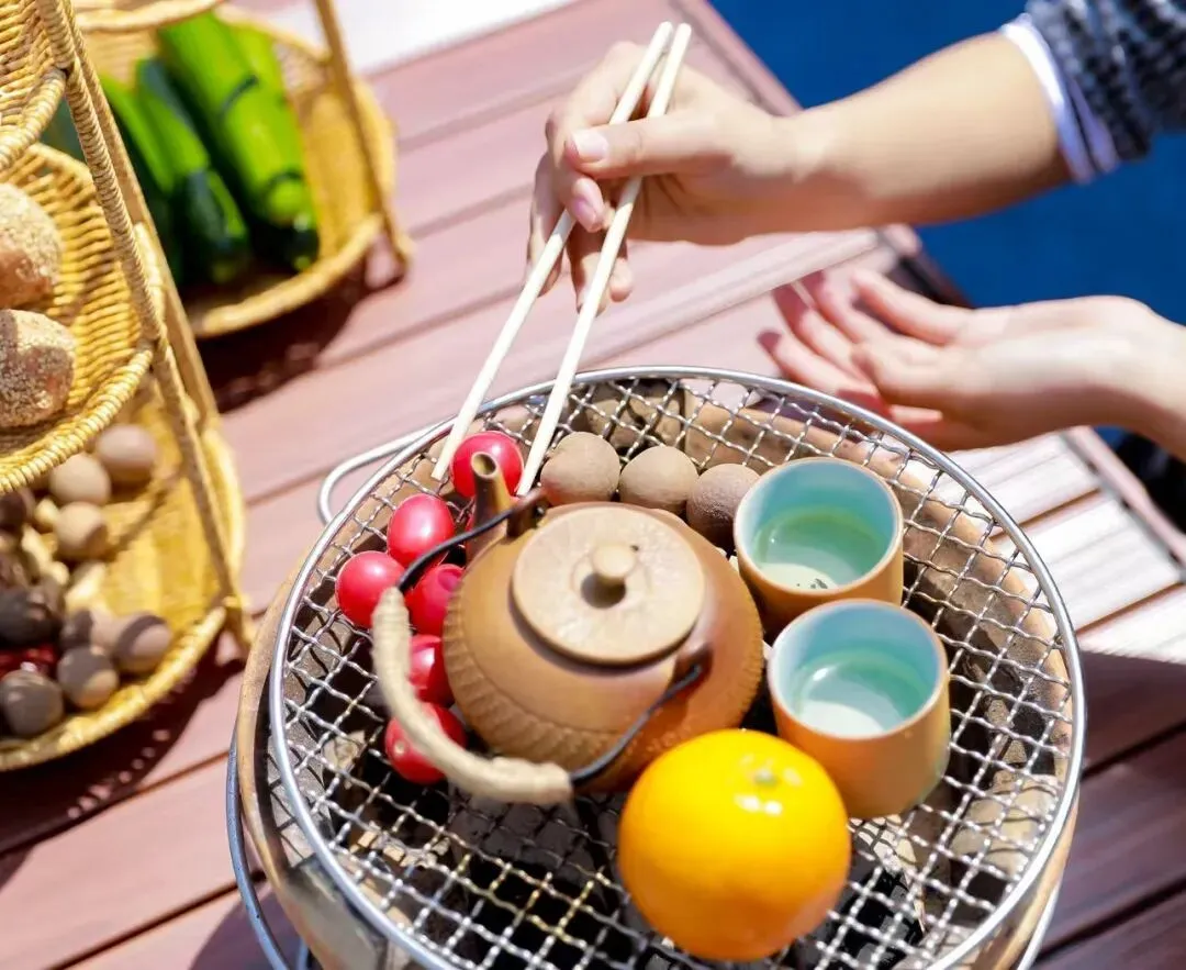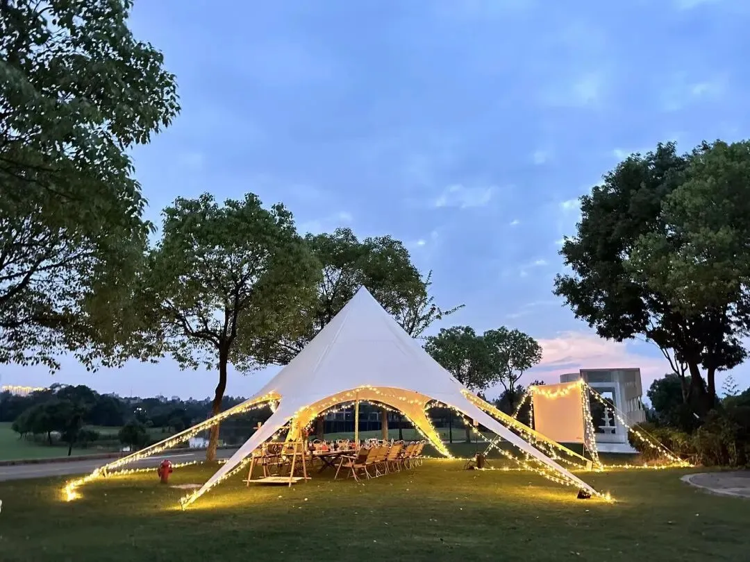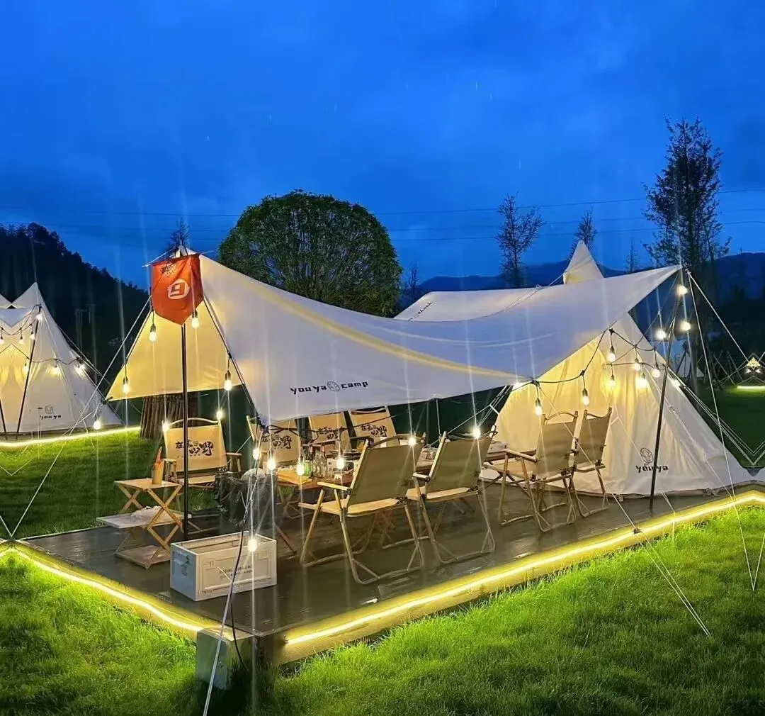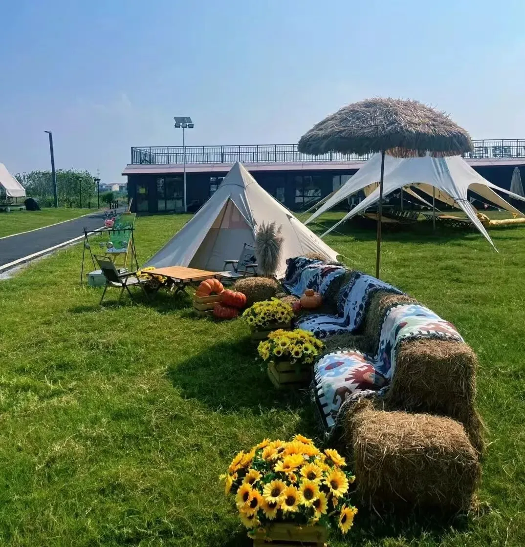 走进那片一望无际的葱郁草坪,高级感十足的帐篷和装备已然就绪,鲜花、美食、咖啡的香气萦绕四周。你无需动手,便能坐拥一切:在阳光下围炉煮茶,在夜幕中看一场露天电影,让繁星与氛围灯交织成梦幻的背景。这里是露营初级爱好者的天堂,也是都市人快速充电的“精神绿洲”。