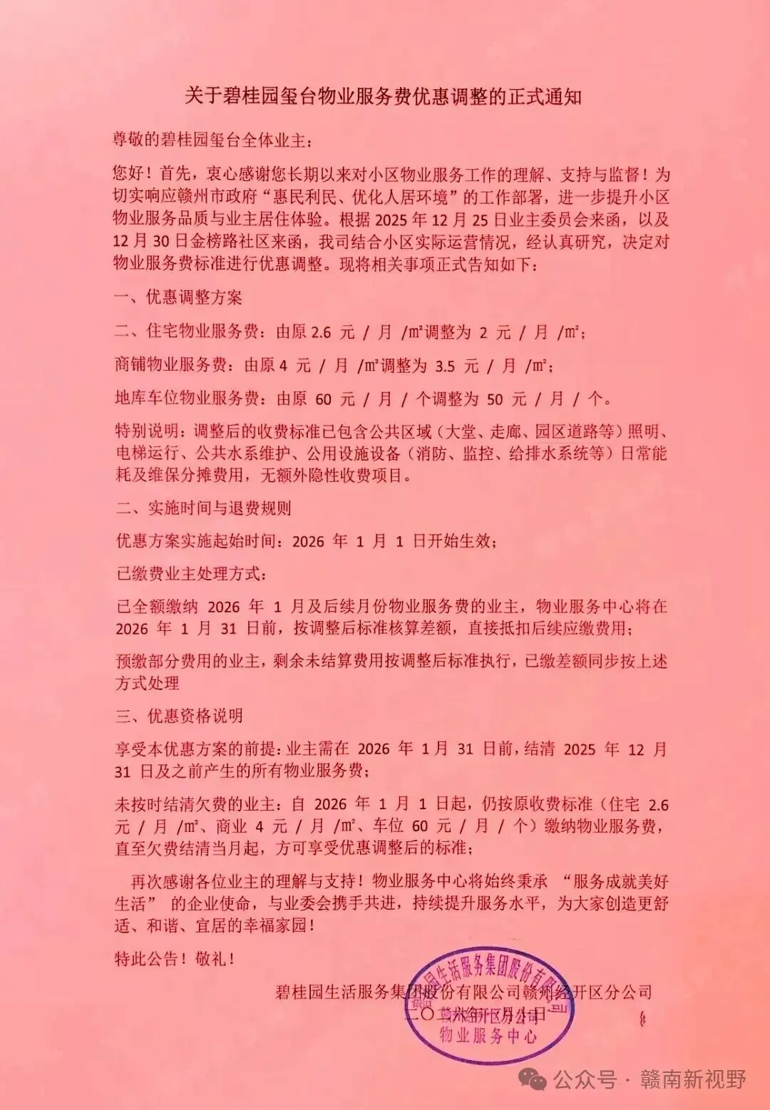 自碧桂园玺台小区业主委员会成立后,在金榜路社区的全程指导与监督下,业委会就物业费调整事宜与物业公司展开了多轮协商。2026年1月10日,碧桂园生活服务集团股份有限公司赣州经开区分公司正式发布《关于碧桂园玺台物业服务费优惠调整的通知》,对收费标准进行了适当下调。具体调整内容如下: