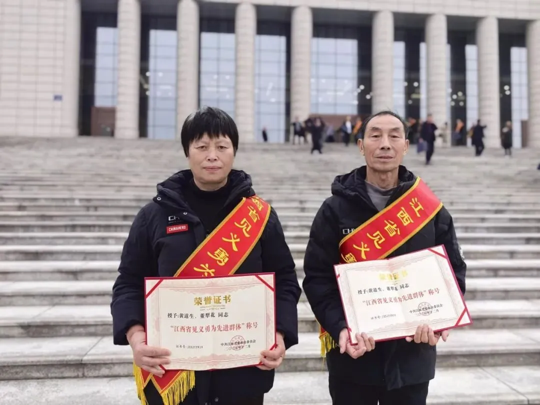 全省见义勇为工作会议日前在南昌召开,会上集中表彰了我省近年来见义勇为先进典型。乐安县鳌溪镇金域龙城小区的居民黄道生、董犁花夫妇,因2024年4月徒手勇斗歹徒、救下濒危幼童的英勇事迹,荣获“江西省见义勇为先进群体”称号。这对年近七旬的夫妻,在危急时刻以果敢与善良撑起生命的保护伞,成为赣鄱大地上见义勇为的鲜活典范。