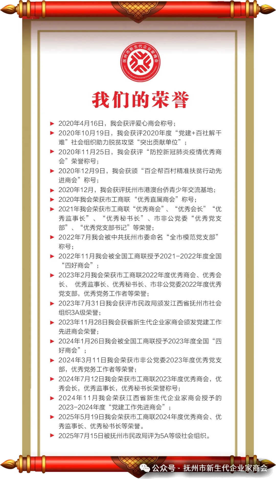 商会成立六年多来,深得政府部门认可并屡获殊荣,连续多年被评为全国“四好”商会。2025年7月被评为5A级社会组织。欢迎在我市创业的精英代表、在不同领域和行业中积极上进的优秀青年申请加入新生代企业家商会,携手并进,共同发展。(注:入会申请请咨询商会秘书长或任意一位商会成员。)