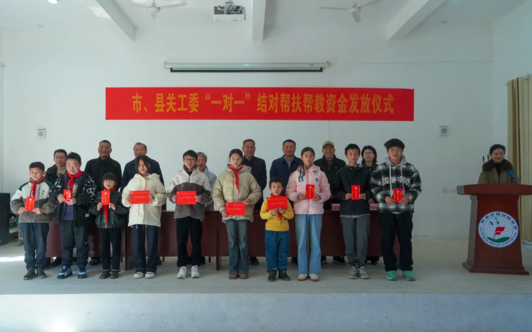 随后,在新丰中学大礼堂,市、县两级关工委联合举办“一对一”结对帮扶帮教困境青少年助学金发放仪式。仪式现场简洁而庄重,谢发明一行与10名受助学生面对面亲切交流,仔细询问每位学生的家庭状况、学习进度及生活难题,亲手将助学金送到同学们手中,并送上新春的美好期许。