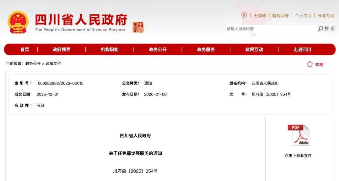 四川省人民政府网站发布《四川省人民政府关于任免郑戈等职务的通知》。