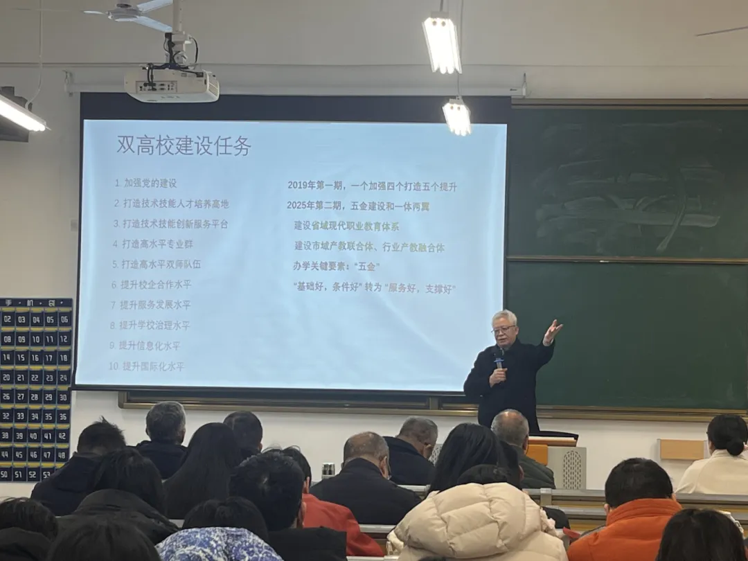 为了促进教师将个人教学发展与学校双高建设、区域产业升级紧密结合,我校特邀原深圳职业技术大学温希东教授围绕“双高计划”核心要义展开深度解读,层层深入剖析了双高建设对教师队伍提出的新要求。温希东教授指出,高校聚焦人才培养、科研、社会服务、文化传承与创新四大使命,双高校建设需以党建为引领,聚焦十大核心任务,秉持“苦干加巧干”思路,强化校企合作、师资队伍、信息化建设。同时强调要兼顾质量与亮点,推动办学从“基础好、条件好”向“服务好、支撑好”转变,为高职院校高质量发展指明方向。