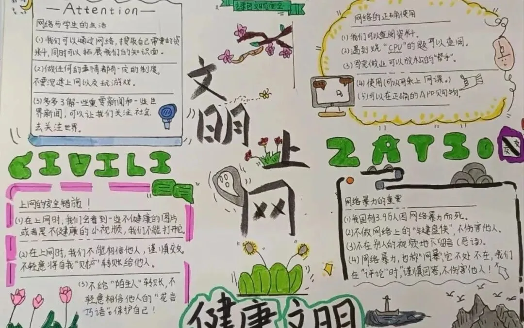 一张张手抄报图文并茂、生动活泼,展示出了孩子们对网络安全与文明的认识和重视,流露出孩子们对“网络文明”的真切体会。