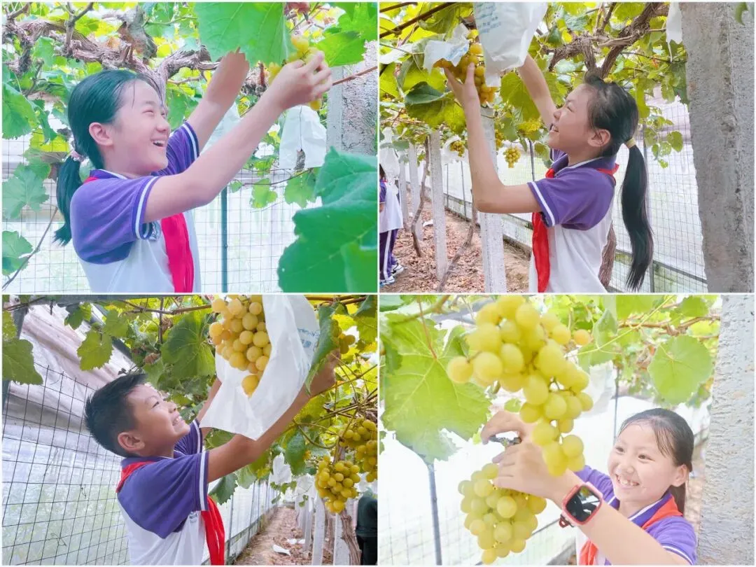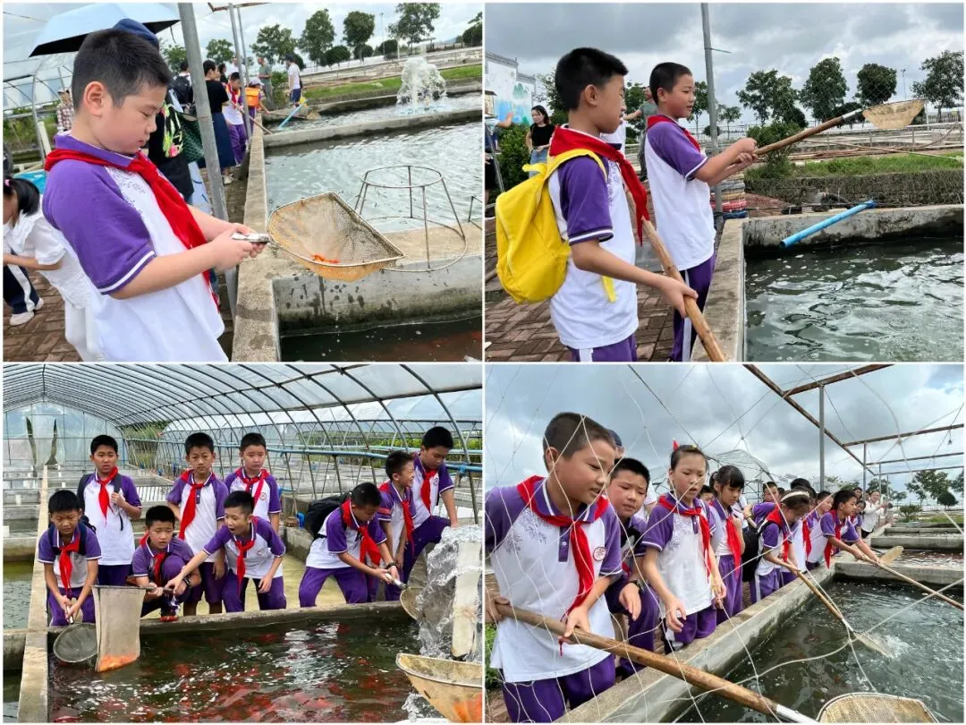 少先队员们在鱼苗培育基地尝试挑鱼捞鱼,听技术员介绍鱼苗挑选、鱼池护理知识。在大棚里观察一株株火龙果树攀援在木柱上,长势旺盛,红彤彤的火龙果挂满枝头,体验亲手剪下成熟葡萄串,用自己的零花钱积极参与爱心助农活动。