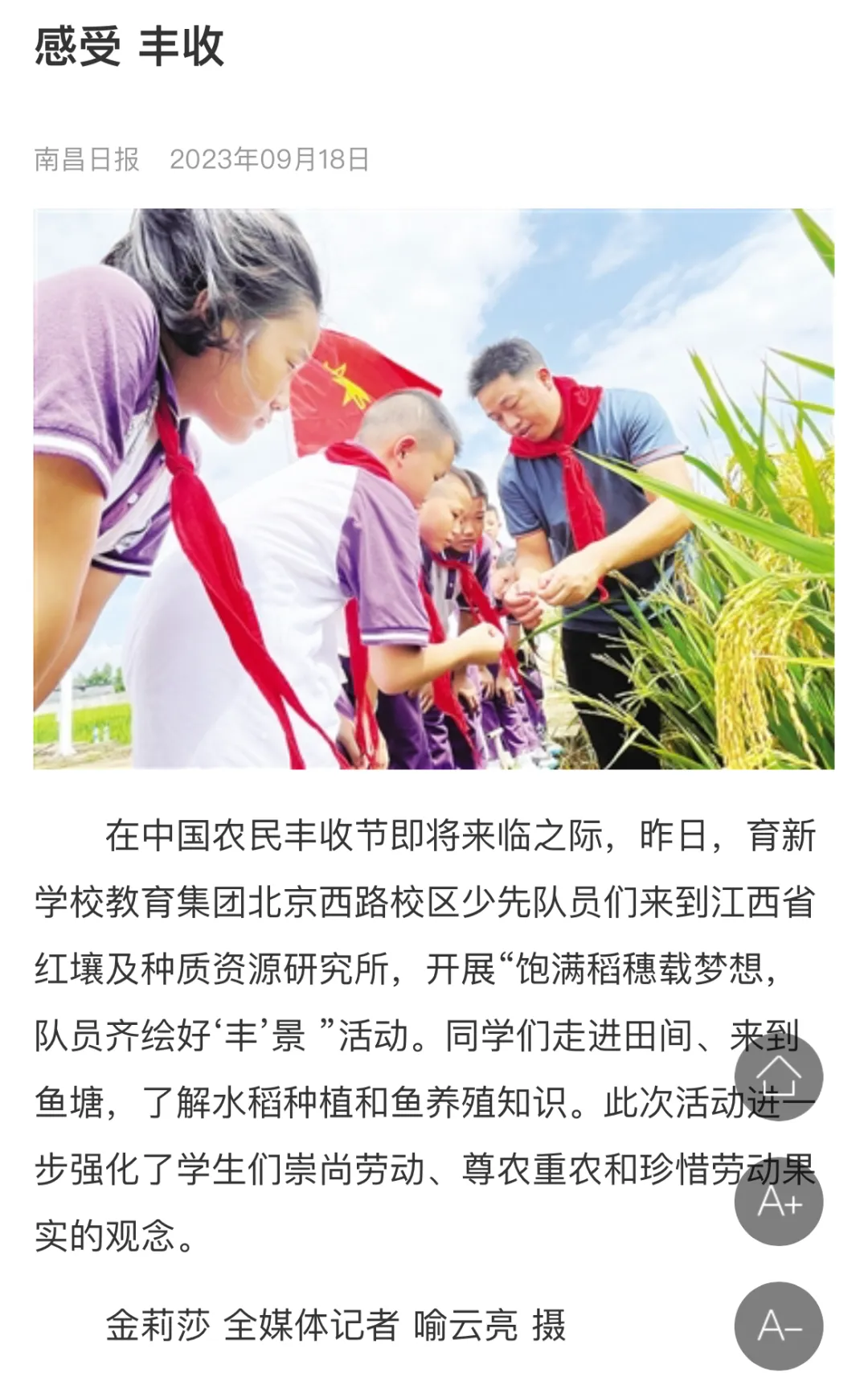 南昌市育新学校教育集团开展“饱满稻穗载梦想 队员齐绘好'丰'景”中国农民丰收节活动