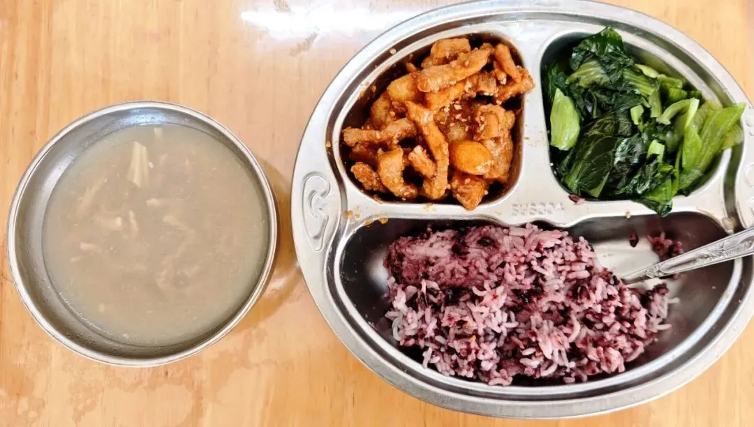 黑米饭、糖醋里脊、清炒小白菜、三鲜汤